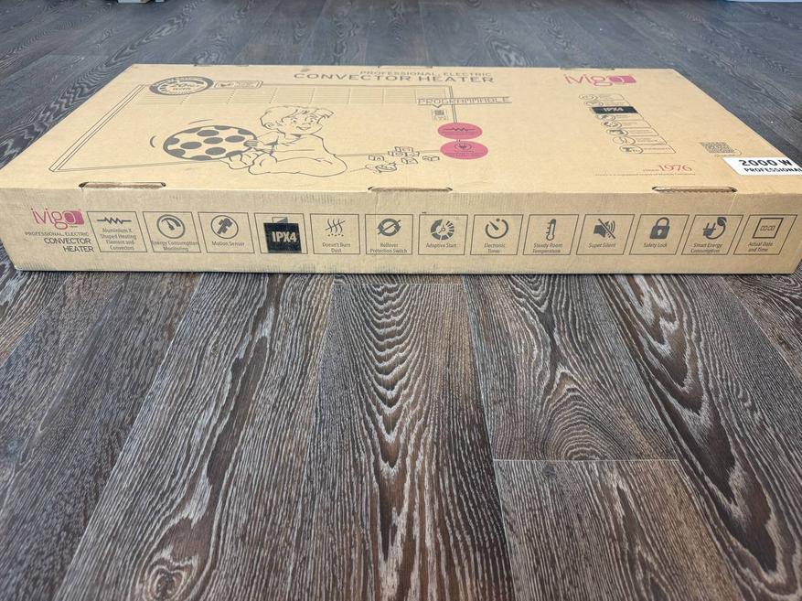 Конвектор приходит в крупной картонной коробке с изображением самого устройства. На главной можно видеть сам конвектор и играющего рядом с ним ребенка. Производитель как бы отмечает, что устройство безопасно и можно не переживать за находящихся рядом с ним детей. Снизу можно увидеть пиктограммы с дополнительными функциями конвектора. Сбоку базовые характеристиками и указание на то, что производится устройство именно в Турции.