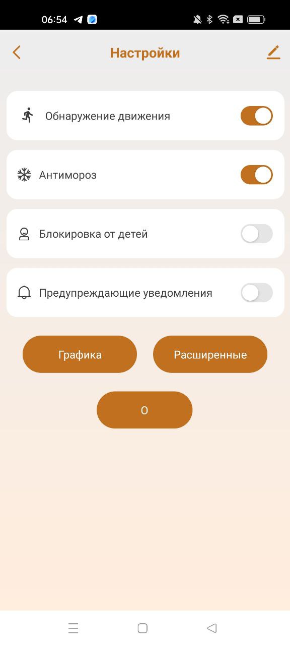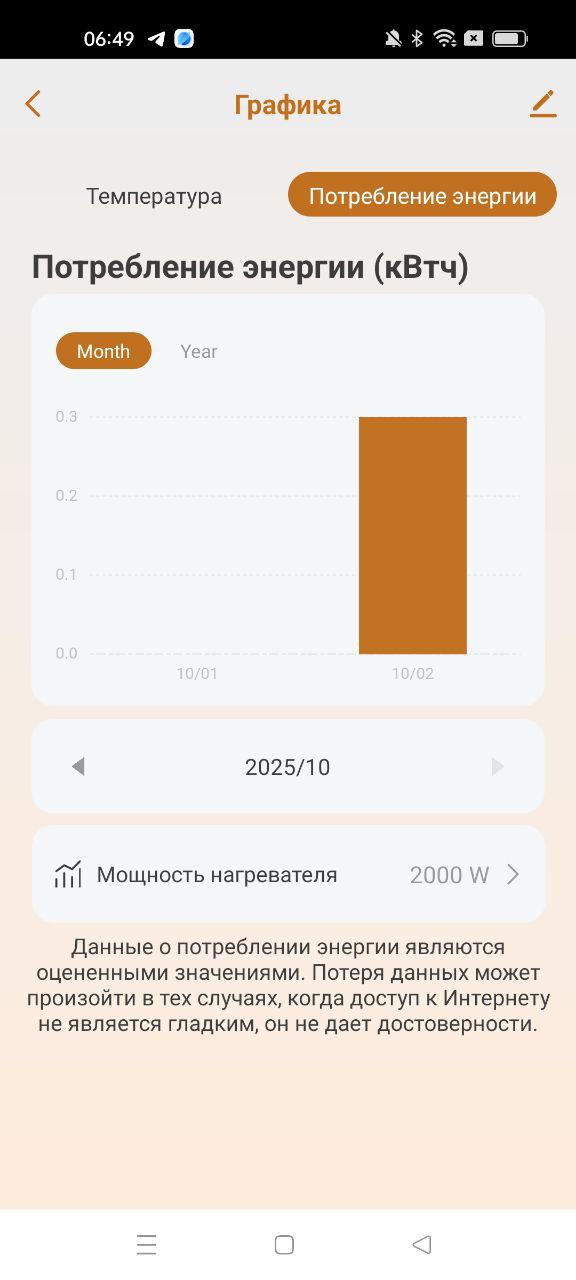 Через Wi-Fi конвектор подключается к фирменному приложению Ivigo. Интерфейс простой, поддержка русского языка присутствует, хотя перевод местами корявый. В приложении можно: дистанционно включать/выключать устройство, следить за температурой и настраивать нужную, включать дополнительные возможности типа отключения при проветривании и обнаружение движения, включать таймер от 1 до 8 часов, а также просматривать графики температуры и потребления энергии.