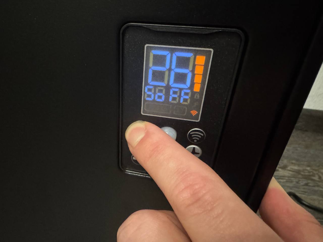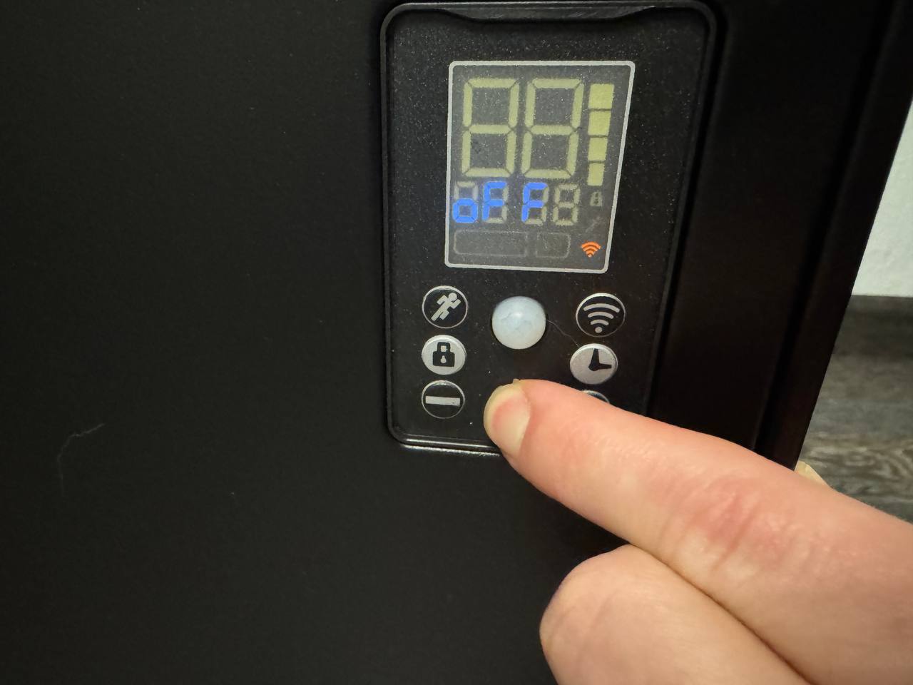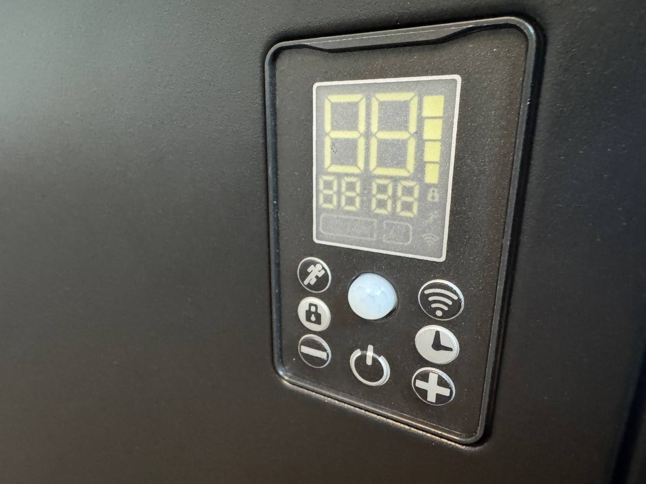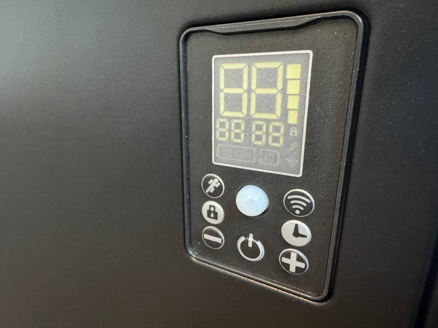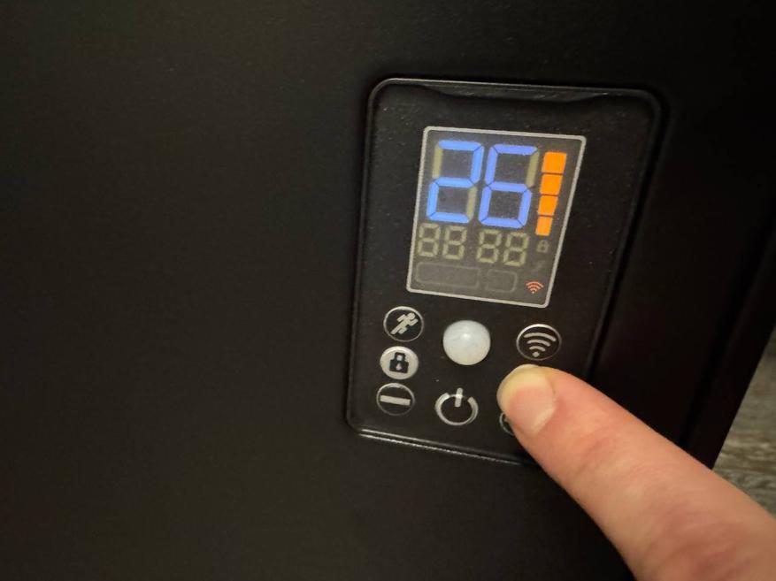 Справа на лицевой панели находится панель управления с цифровым дисплеем и механическими кнопками. Также среди элементов управления присутствует датчик движения. Интерфейс простой: выбор температуры, блокировка клавиш, режимы таймера и датчика движения, а также подключение к Wi-Fi.