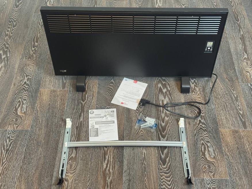 Внутри коробки находим сам конвектор (размером 900х450х80 мм), набор креплений для настенного монтажа, а также ножки для установки на пол. Это удобно — можно выбрать, как именно использовать прибор: поставить в комнате или повесить стационарно. Все элементы крепежа выглядят добротно — уверенные дюбели и длинные шурупы. В комплекте есть также инструкция с переводом на русский язык и гарантийный талон. Гарантия, кстати, целых 10 лет и в случае поломки производитель обязуется отправить новый конвектор в замен на сломанный старый.