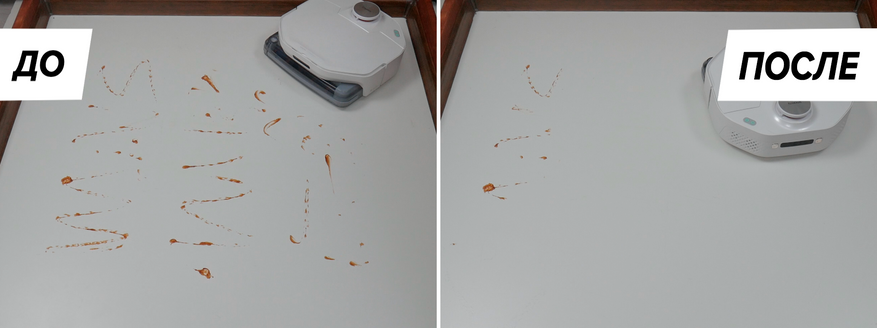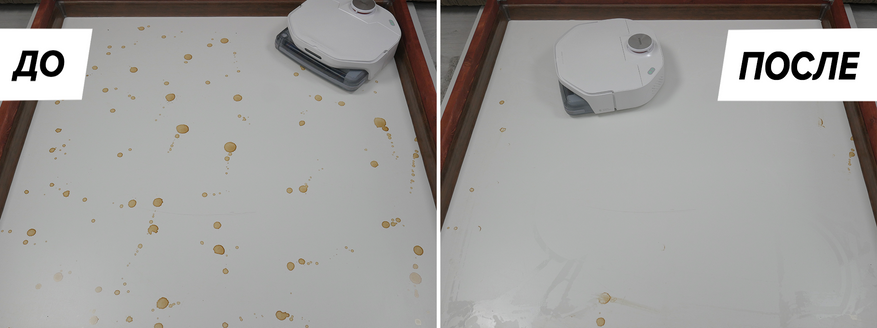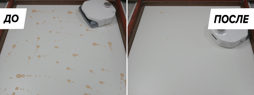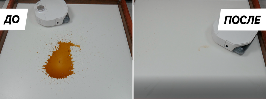 В течение двух минут после запуска Smartmi A1 смачивает валик и лишь затем начинает мыть пол. Но качество уборки высокое. Кофейные пятна отмывает с 2-х проходов, присохший сок – с 4-х.