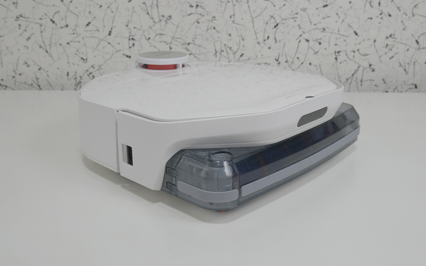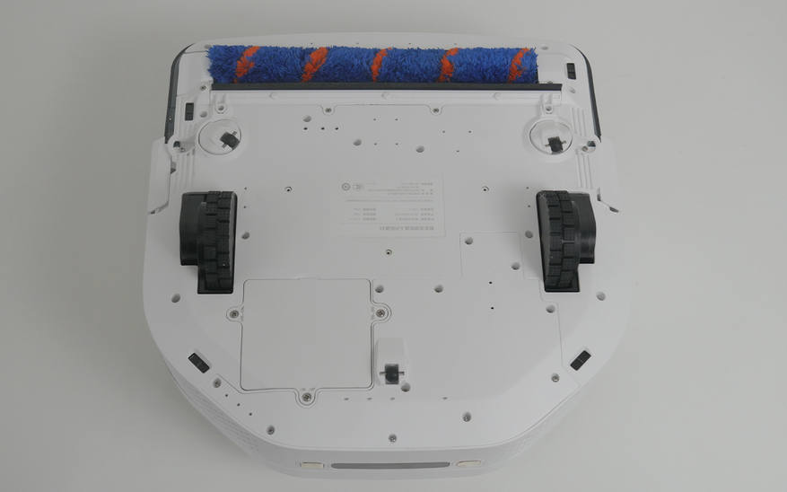 Самое интересное в Smartmi A1 – конструкция днища. От обычного робота-пылесоса здесь только ведущие колёса и датчики падения. Раструб вынесен вперед, и в нём установлен мохнатый валик. Извлечь его не составляет труда – достаточно открыть фиксатор сбоку. Для подачи воды перед раструбом вмонтированы 4 сопла. Робот брызгает воду на пол, оттирает грязь валиком и собирает остатки влаги скребком. Чтобы конструкция была более устойчивой, установили целых 3 дополнительных ролика, которые неизбежно будут забиваться волосами. Время от времени их придётся прочищать.