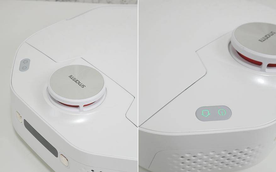 Лидар вынесли назад. Рядом с ним две кнопки управления: старт/пауза и «домой». О смене рабочего состояния робот сигнализирует световой индикацией и голосовыми сообщениями.