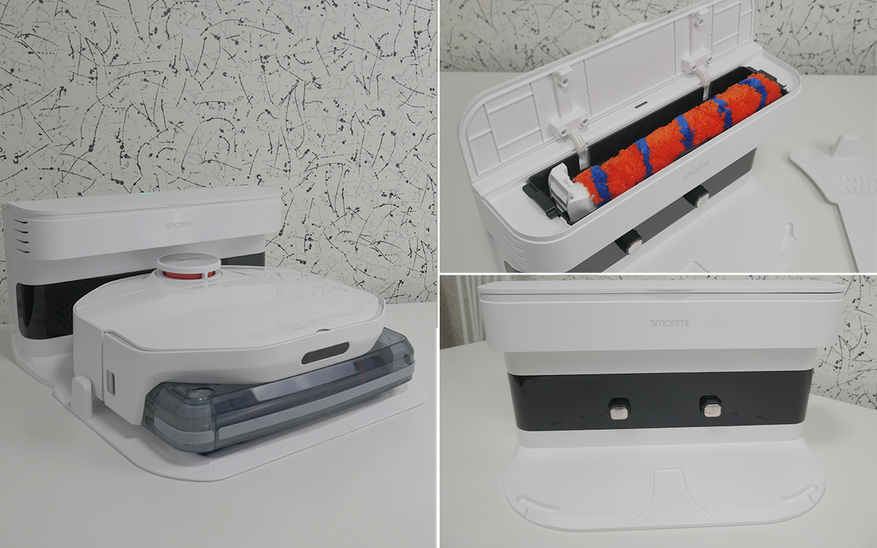 По своей форме док-станция напоминает стандартную базу для подзарядки, только в три раза больше и с удлиненной парковкой. Однако, кроме зарядки аккумулятора, она выполняет и другие функции. Во-первых, у неё есть специальное углубление, где пылесос полощет валик после уборки (после чего сушит прямо в раструбе). Во-вторых, под крышкой вверху есть отсек для хранения и досушки валика. Там же лежит и ёршик для обслуживания.