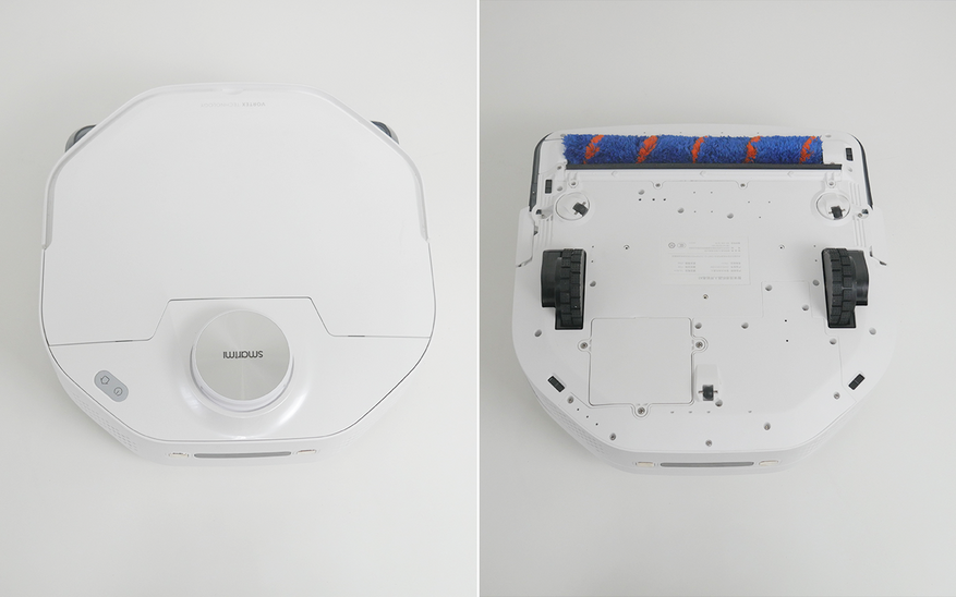 Робот сделан в форме многогранника с прямоугольным бампером. Стиль исполнения типичный для Xiaomi – простой белый корпус, только практичные и функциональные элементы конструкции. По ширине Smartmi A1 такой же, как обычные роботы-пылесосы, но высота корпуса заметно больше – почти 13 см. Из-за этого могут быть проблемы при заезде под мебель.