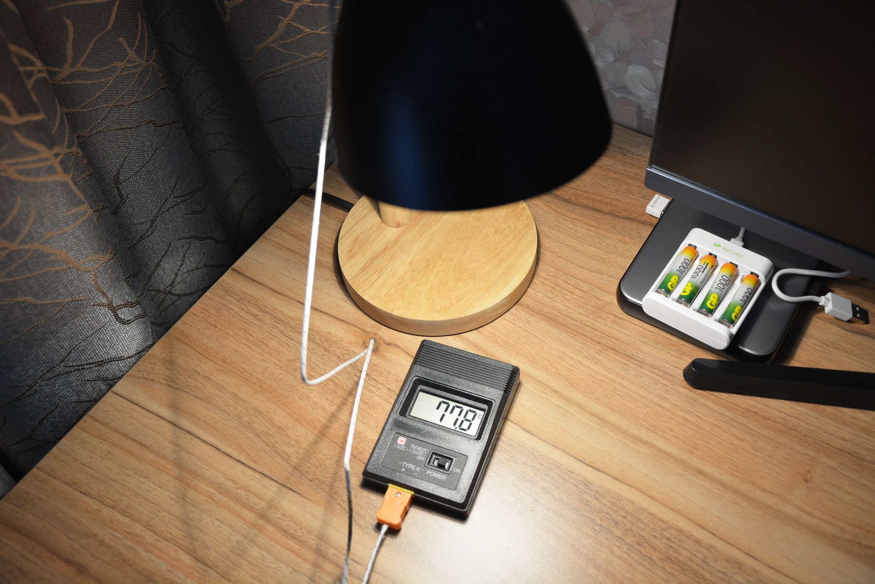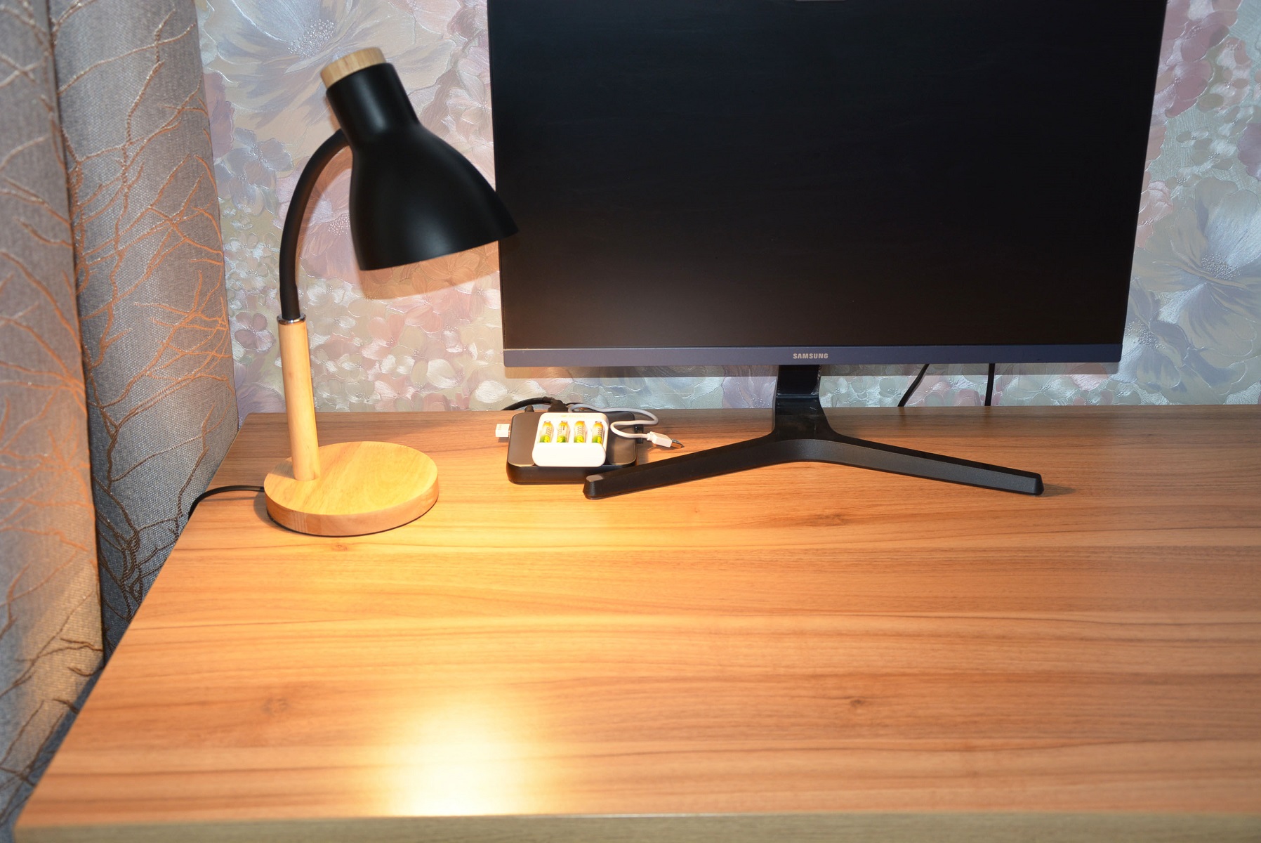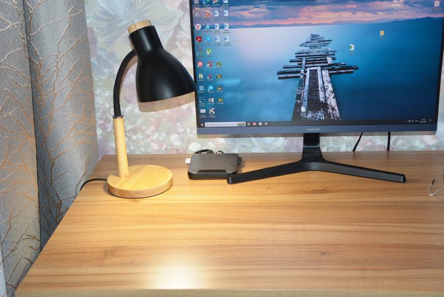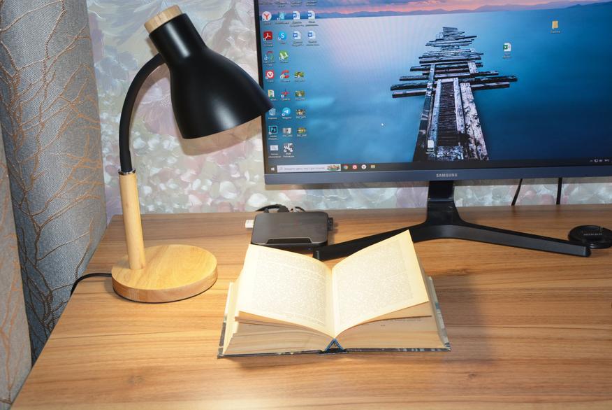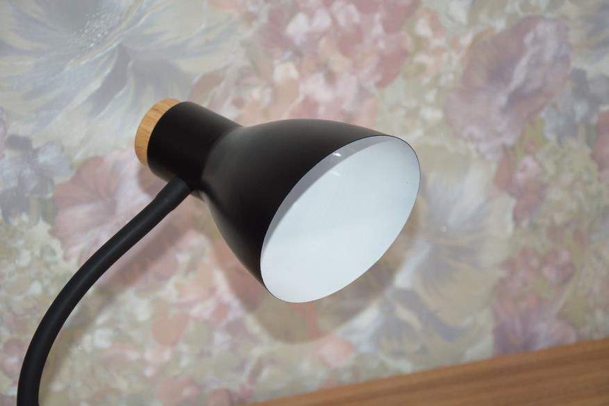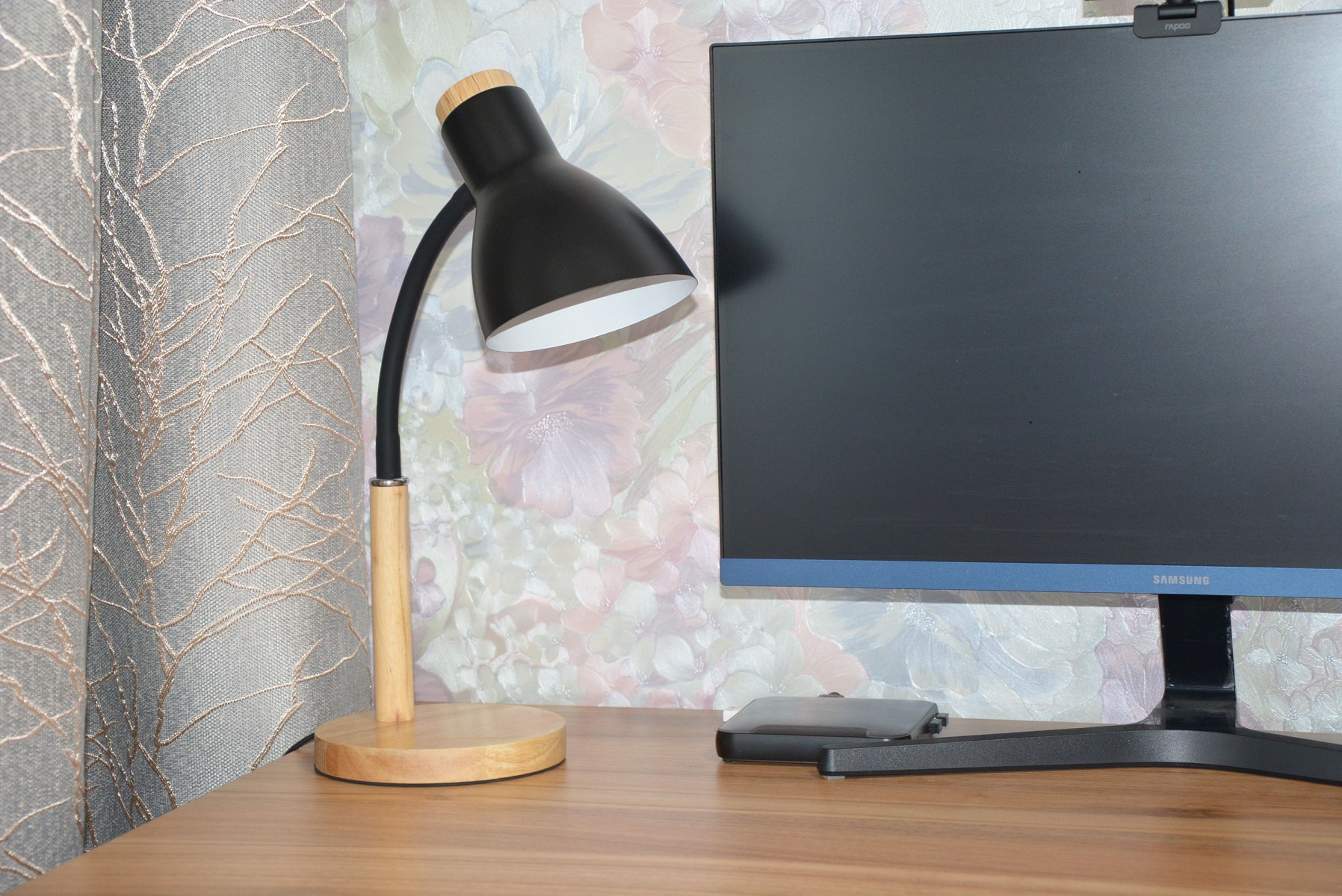 В моем случае светильник отлично вписался в интерьер, заняв место на углу стола. Регулировка наклона позволяет настроить свет на рабочее место, но не в глаза.