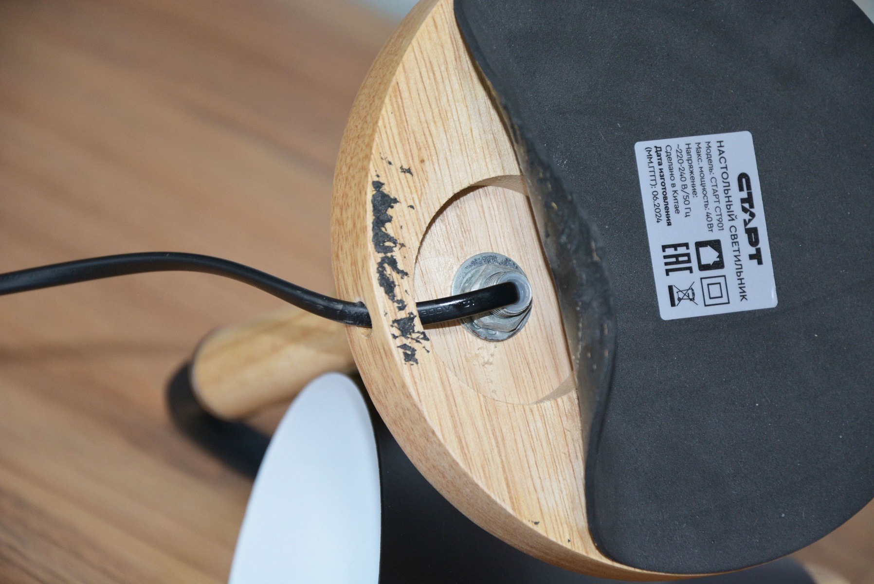 Опорная платформа диаметром 15 см и толщиной 2 см сделана из набранного щита, срощенного по технологии микрошип. Характерный рисунок структуры дерева виден невооруженным глазом. А вот небольшую царапину заметила только камера. Нижняя часть стойки, как и деталь на плафоне, также сделан из дерева.
