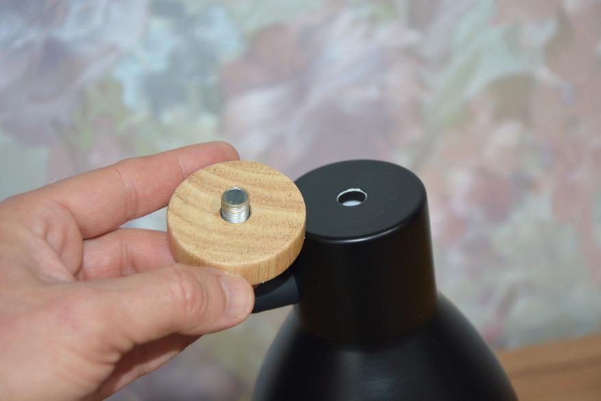 Плафон светильника сделан из алюминия и хорошо будет отводить тепло. Выкрашен он в черный матовый цвет. Сверху якобы декоративный деревянный элемент. На самом деле снизу тут имеется втулка с резьбой, которой притягивается патрон Е27 изнутри плафона.