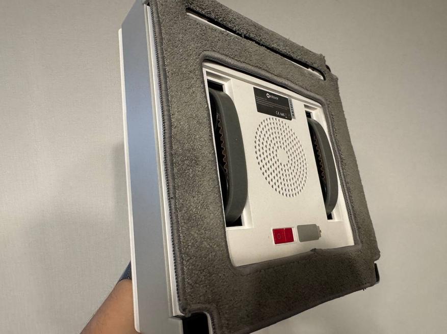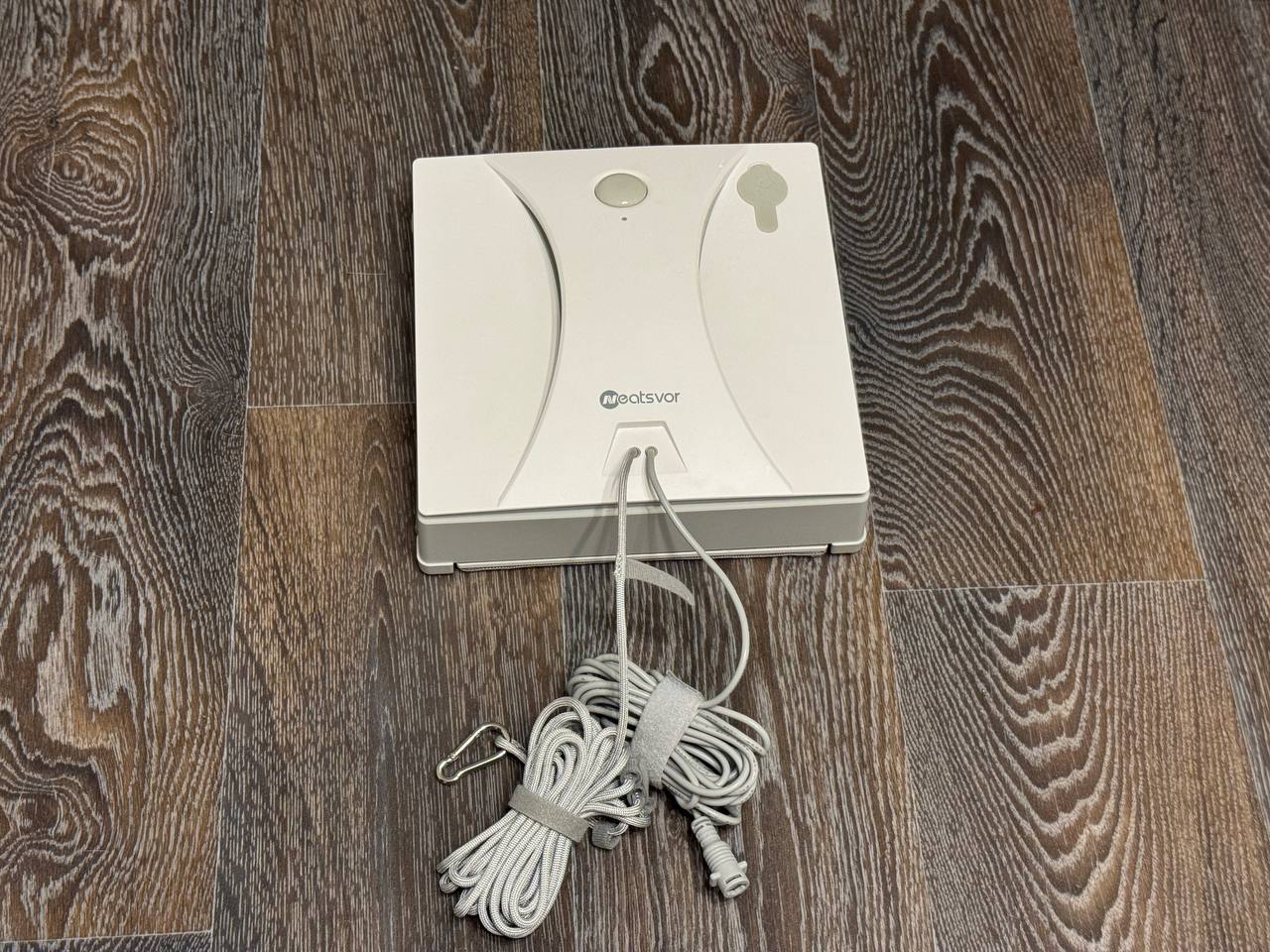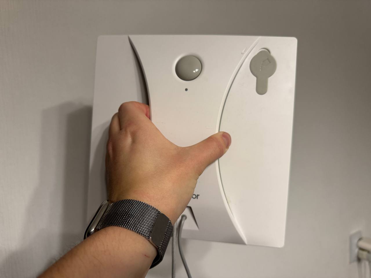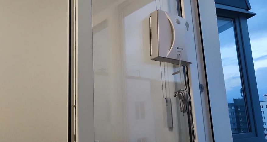 На торцах находятся датчики определения границ, чтобы робот не съезжал с окна или панели. Снизу предусмотрен кабель питания и крепление для страховочного троса. Общий вес чуть больше полутора килограммов, поэтому устройство уверенно держится, но при этом не выглядит громоздким.