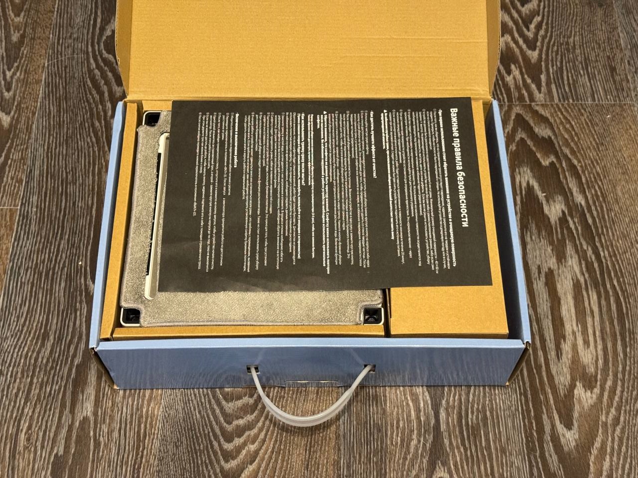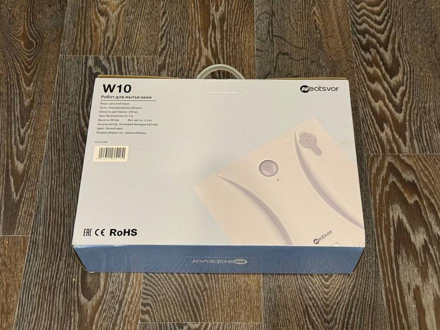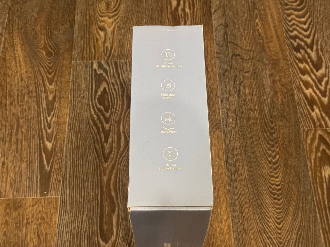 Упаковка встречает плотным картоном с глянцевой полиграфией голубого цвета. Спереди изображение самого робота и основные особенности: умное планирование пути, несколько режимов уборки и система водного распыления. Сбоку перечислены технические характеристики — ёмкость встроенного резервуара для воды, вес устройства, длина страховочного троса. На задней части указаны схемы работы, а сверху предусмотрена аккуратная ручка для переноса. Коробка производит впечатление качественной и продуманной, как у устройств более высокого класса.