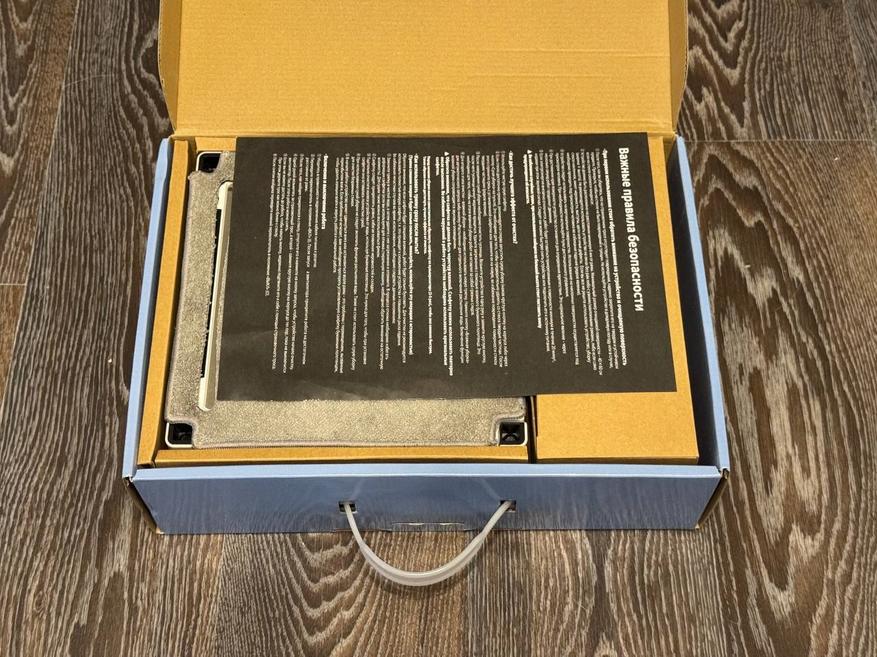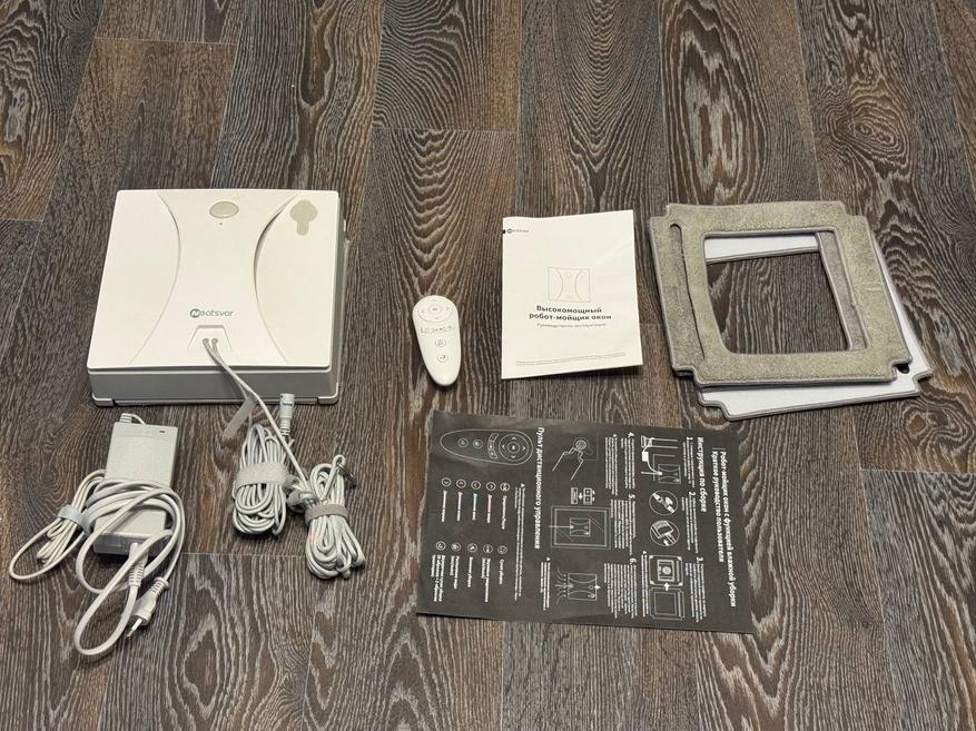 Внутри всё разложено по секциям. Сверху лежит сам робот со страховочным тросом, блок питания с кабелем, пульт, несколько тряпок из микрофибры и даже небольшой распылитель. Инструкция простая, в виде листка с картинками — этого достаточно, чтобы быстро во всем разобраться. Также есть большая инструкция-книжка в том числе на русском языке.