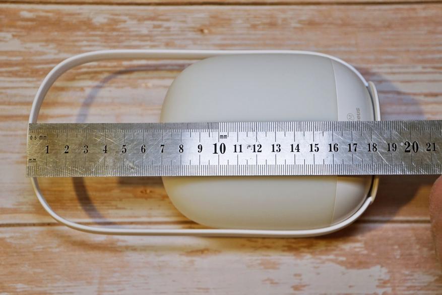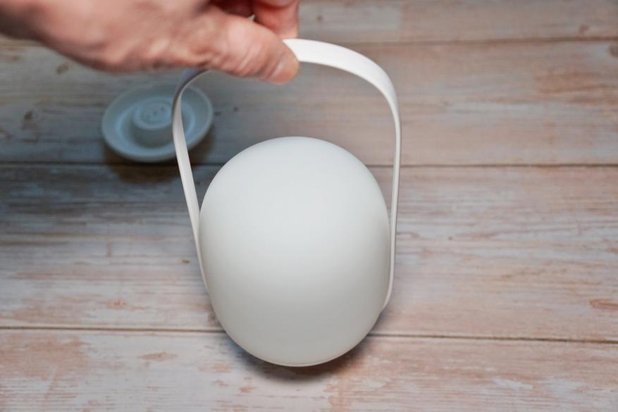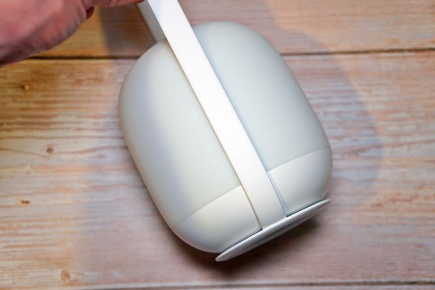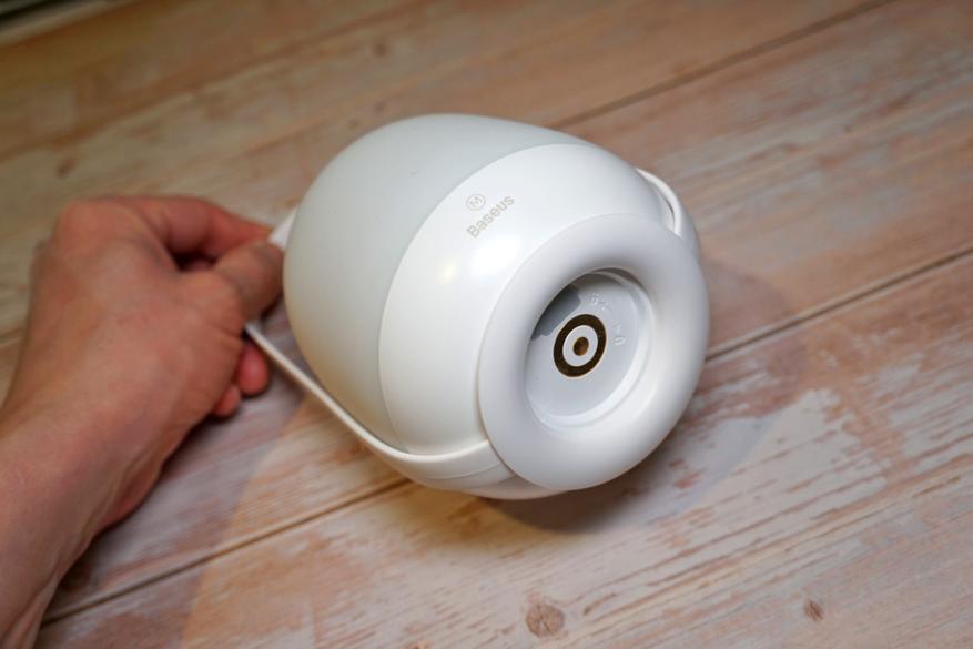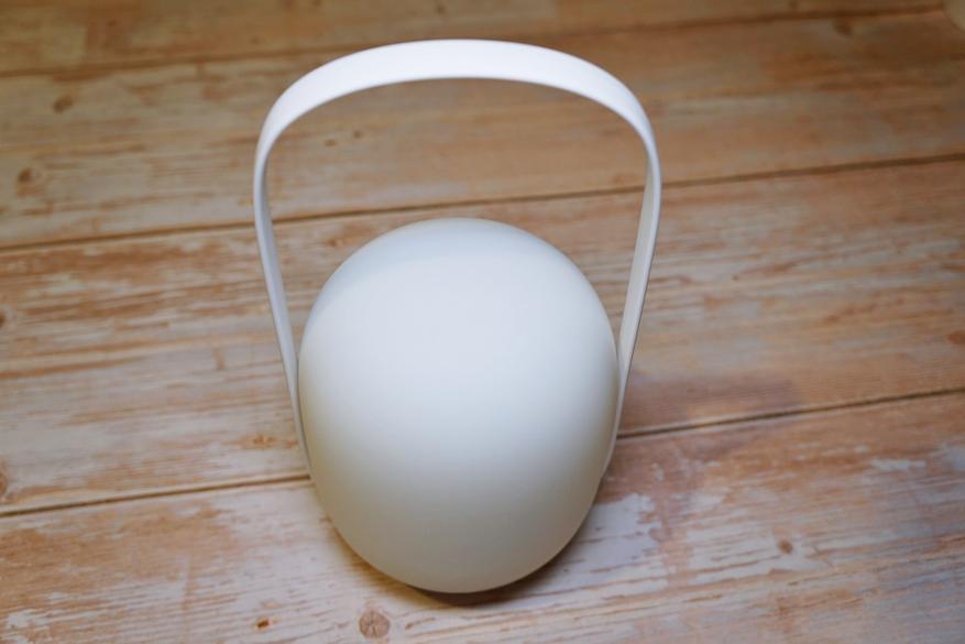 Устройство имеет очень симпатичный дизайн с плавными закругленными формами, выглядит как маленькая луна. В конструкции присутствует удобная ручка для переноски (которую можно отсоединить):