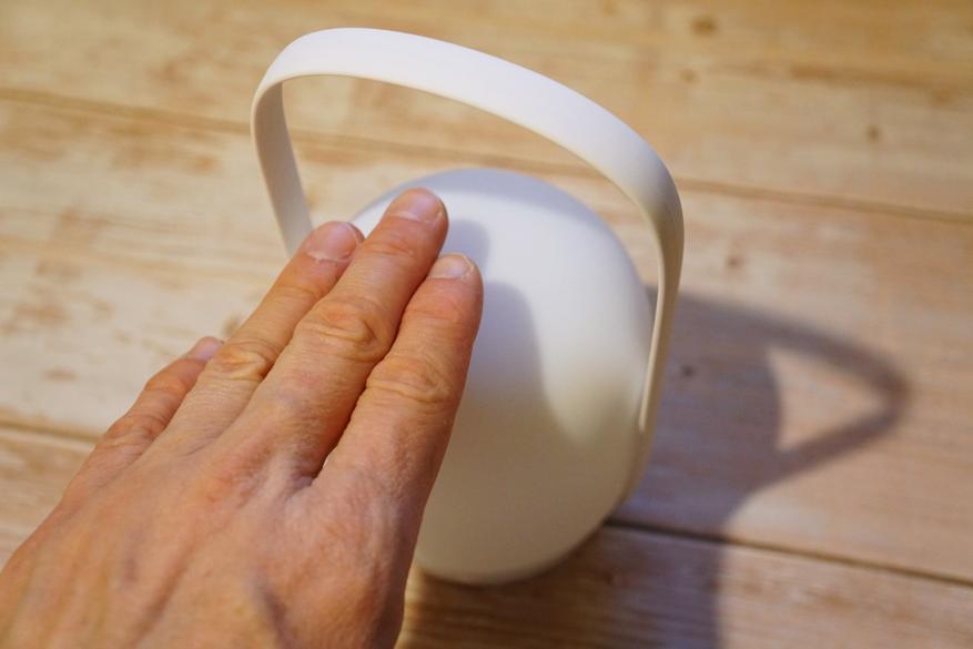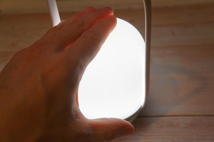 Если положить руку на верхнюю часть и задержать ее на пару секунд, то начнет увеличиваться яркость до максимума, если поднять и снова положить и подержать — начнет снижаться до минимума. Максимум и минимум на фото ниже: