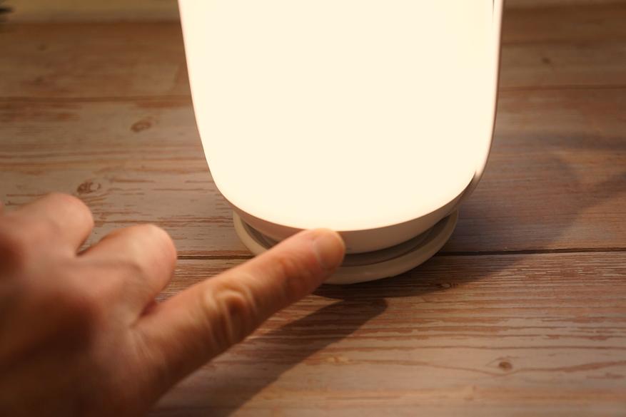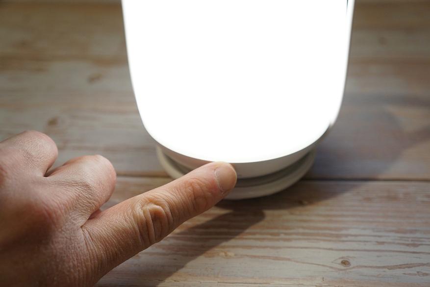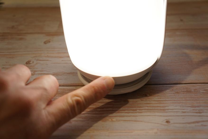 Включается светильник (если он заряжен) двойным касанием рукой верхней части корпуса: