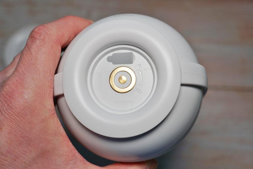 Снизу, по центру, расположена контактная площадка для соединения с зарядной платформой и порт зарядки. Стрелка с замками показывает в каком направлении нужно поворачивать, чтобы снять или зафиксировать ручку для переноски: