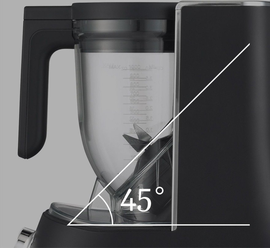 Согласно информации от производителя, наклонное расположение лезвий создает вертикальный поток, обеспечивающий более эффективное перемешивание ингредиентов сверху вниз. Такая конструкция позволяет обрабатывать целые фрукты и овощи без предварительной нарезки, а также справляться с замороженными продуктами и льдом, что недоступно многим стандартным моделям.