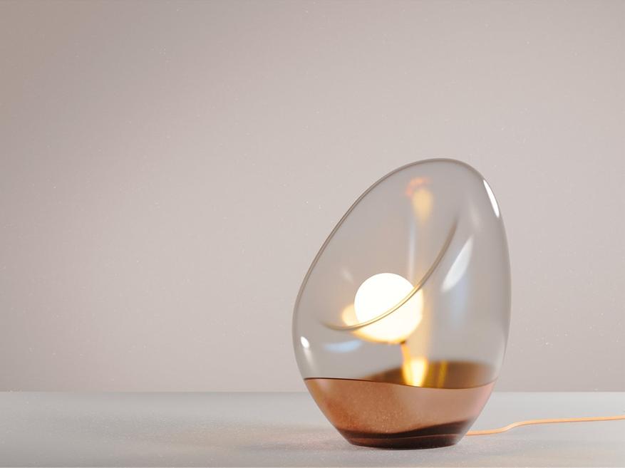 Конструкция лампы основана на принципе контраста между материалом и пустотой. Стеклянный корпус имеет минималистичный дизайн с плавными линиями, что делает его подходящим для различных интерьерных стилей. Размеры светильника компактны, что позволяет размещать его на прикроватных тумбочках, рабочих столах или в зонах отдыха.