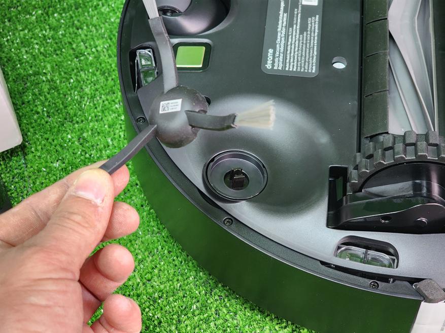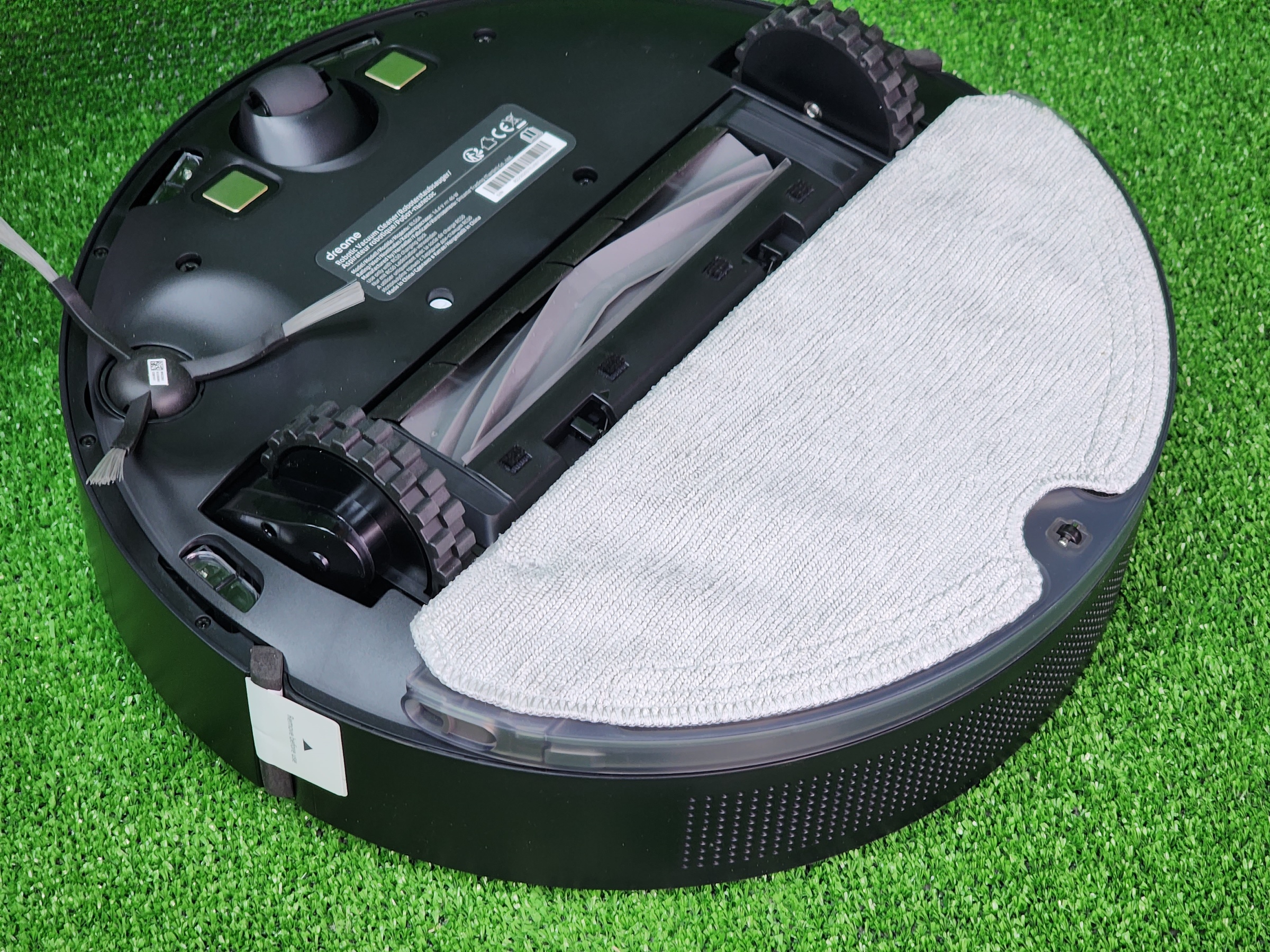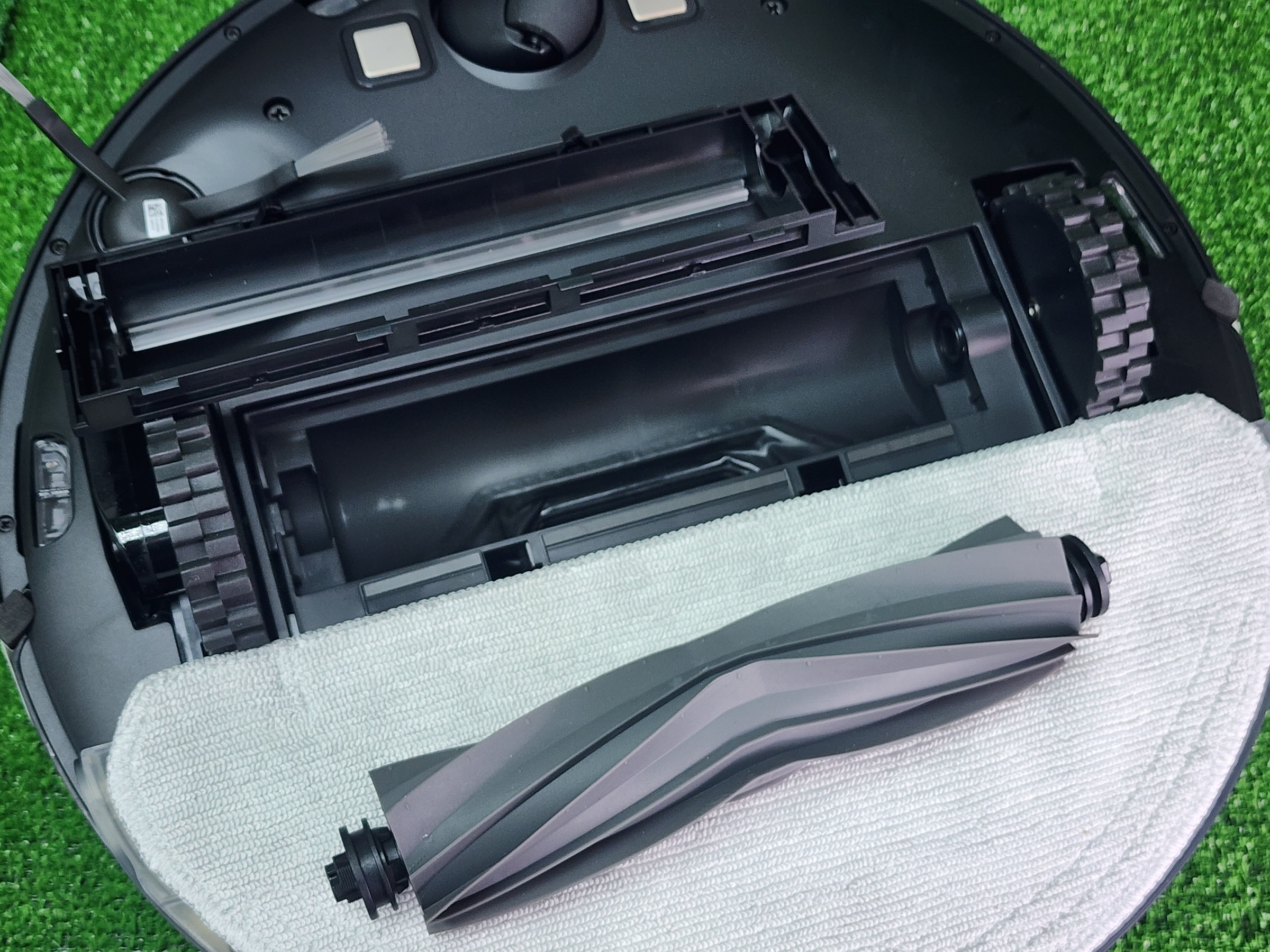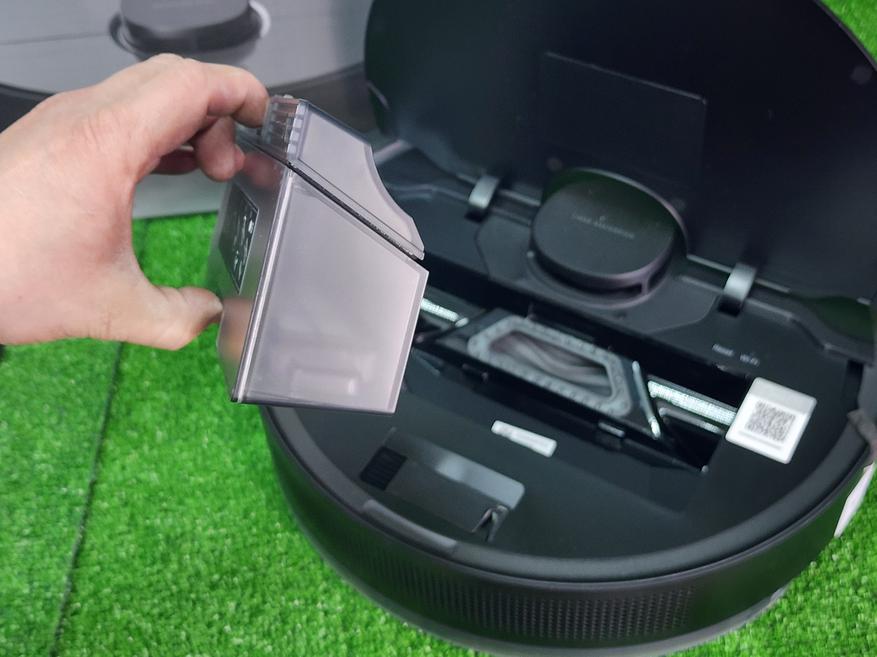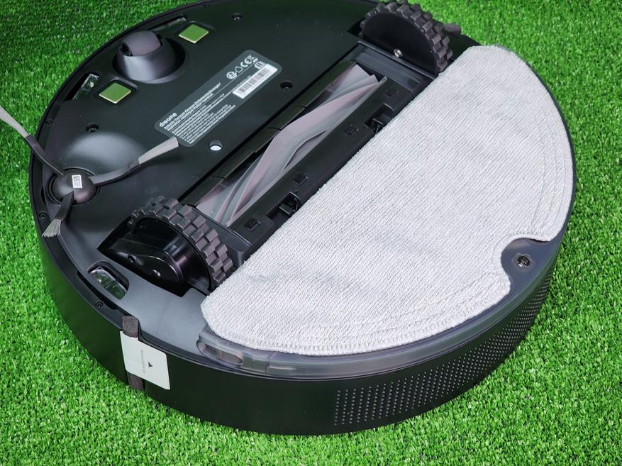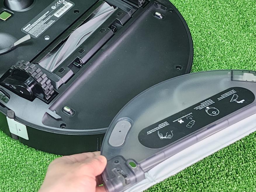 Второй контейнер — резервуар для чистой воды — размещается в специальной пластине, предназначенной для влажной уборки. Для запуска влажной уборки достаточно наполнить пластину водой, установить салфетку, и закрепить на самом роботе в нижней части — пластина автоматически распознается роботом и активируется режим влажной уборки. Степень смачивания салфетки можно выбрать в приложении. С роботом поставляется V-образная турбощетка для сбора волос и шерсти животных. Боковая щетка одна, съемная.