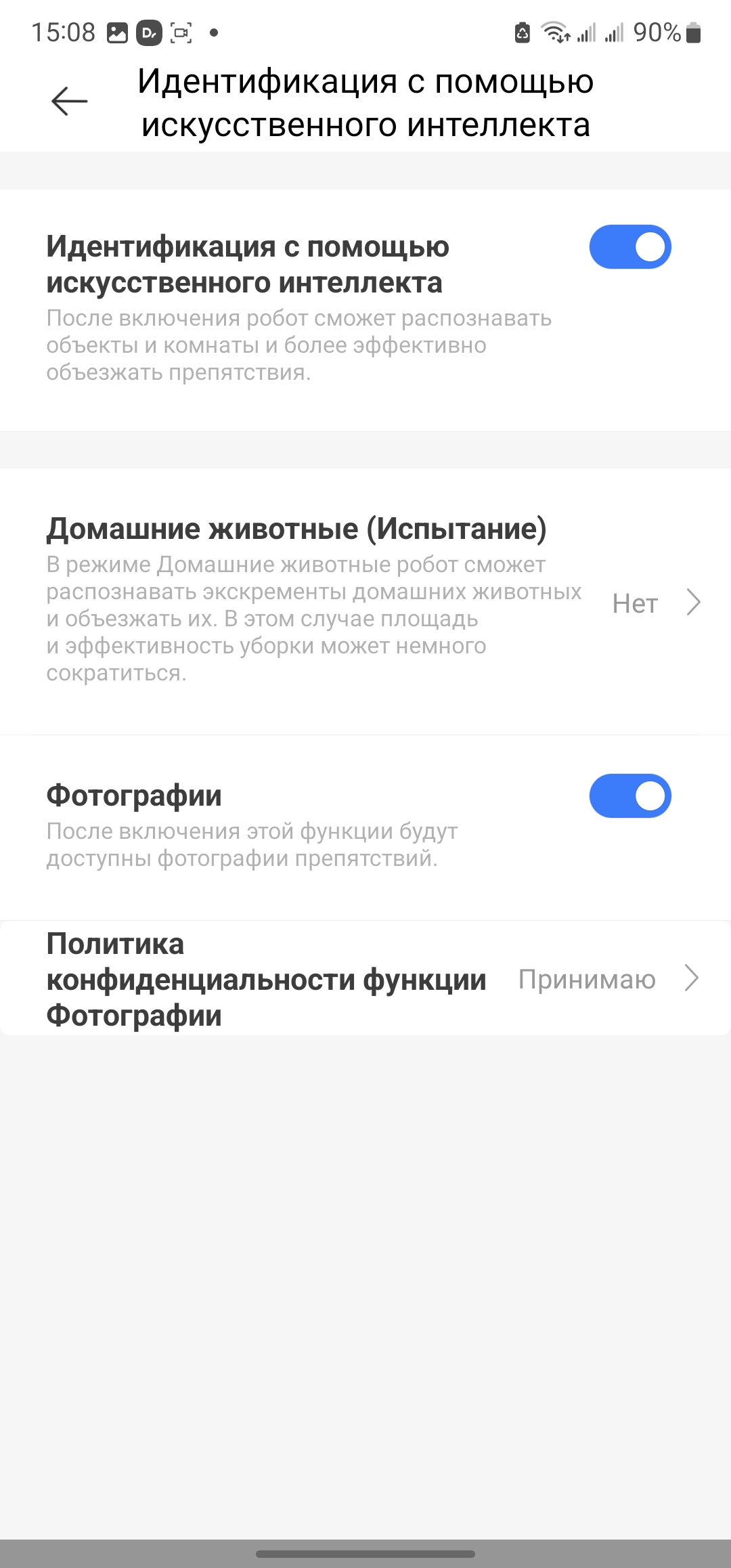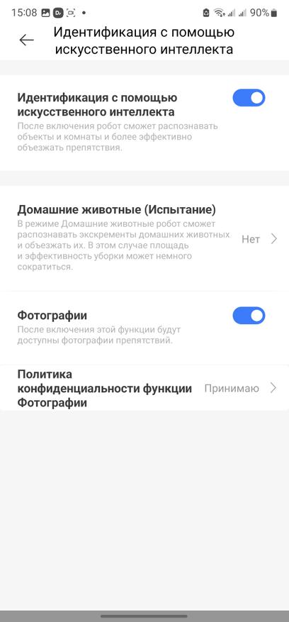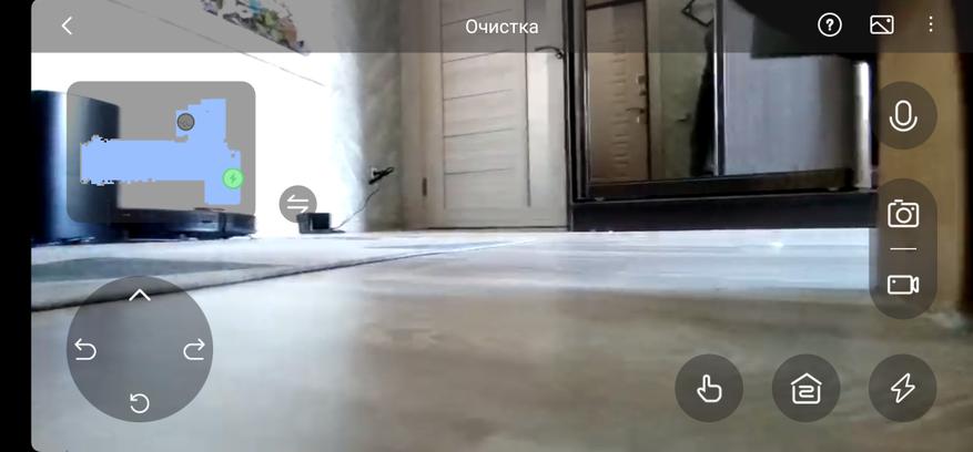Одна из самых главных «фишек» робота — это возможности интеллектуальной камеры AI Action. В первую очередь, камера участвует в работе продвинутых алгоритмов определения препятствий для динамического планирования пули и уклонения от столкновений. С такой камерой внезапно появившийся ребенок или пробежавший домашний питомец не станут помехой роботу, путь уборки динамически сменится, уборка будет продолжена с последующим возвратом на пропущенное место. Также камера доступна пользователю во время уборки. Просто заходим в соответствующий раздел меню, видим где застрял робот, можем им управлять. Довольно удобно иметь возможность удаленно проинспектировать дом. В меню доступа к камере имеется джойстик для управления перемещения роботом, включение микрофона, сохранение фото или видеофайла.