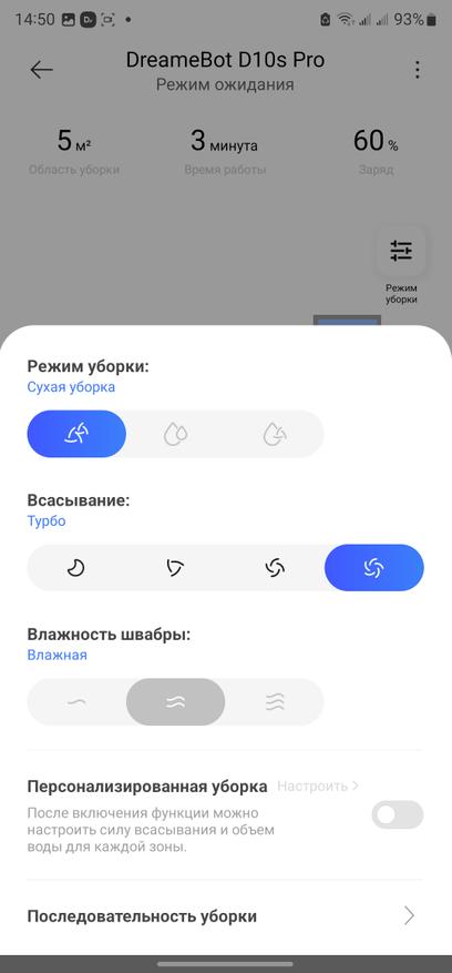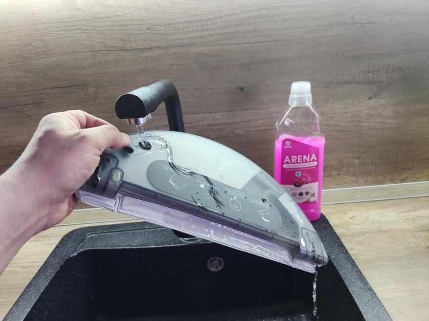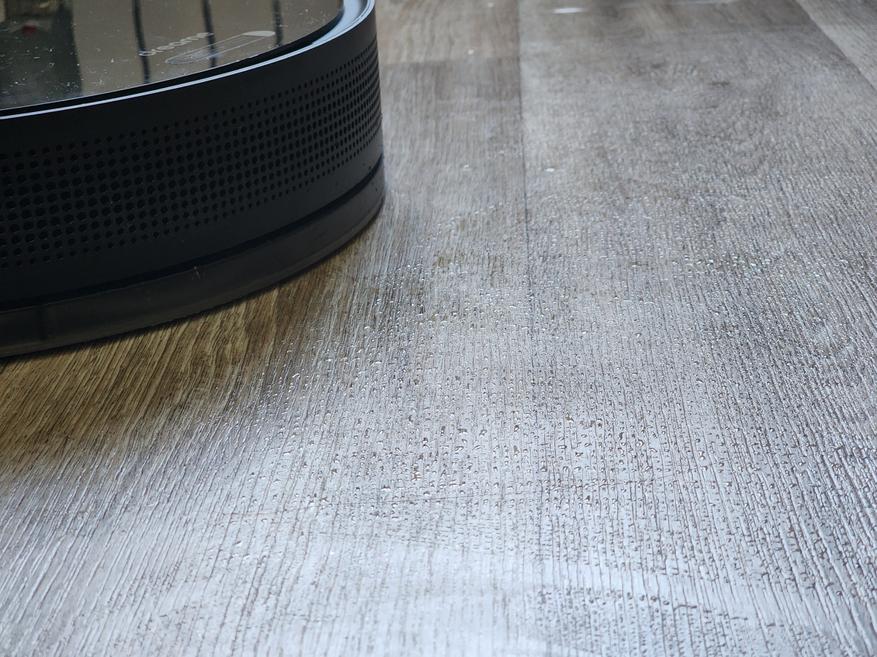 Для запуска цикла влажной уборки достаточно наполнить резервуар чистой водой с небольшим количеством моющего средства. Далее, закрепляем салфетку и устанавливаем пластину для мытья на самом роботе. Можно запускать влажную уборку. Приложение позволяет выбрать степень смачивания салфетки, что удобно, если у вас на полу паркет или ламинат.