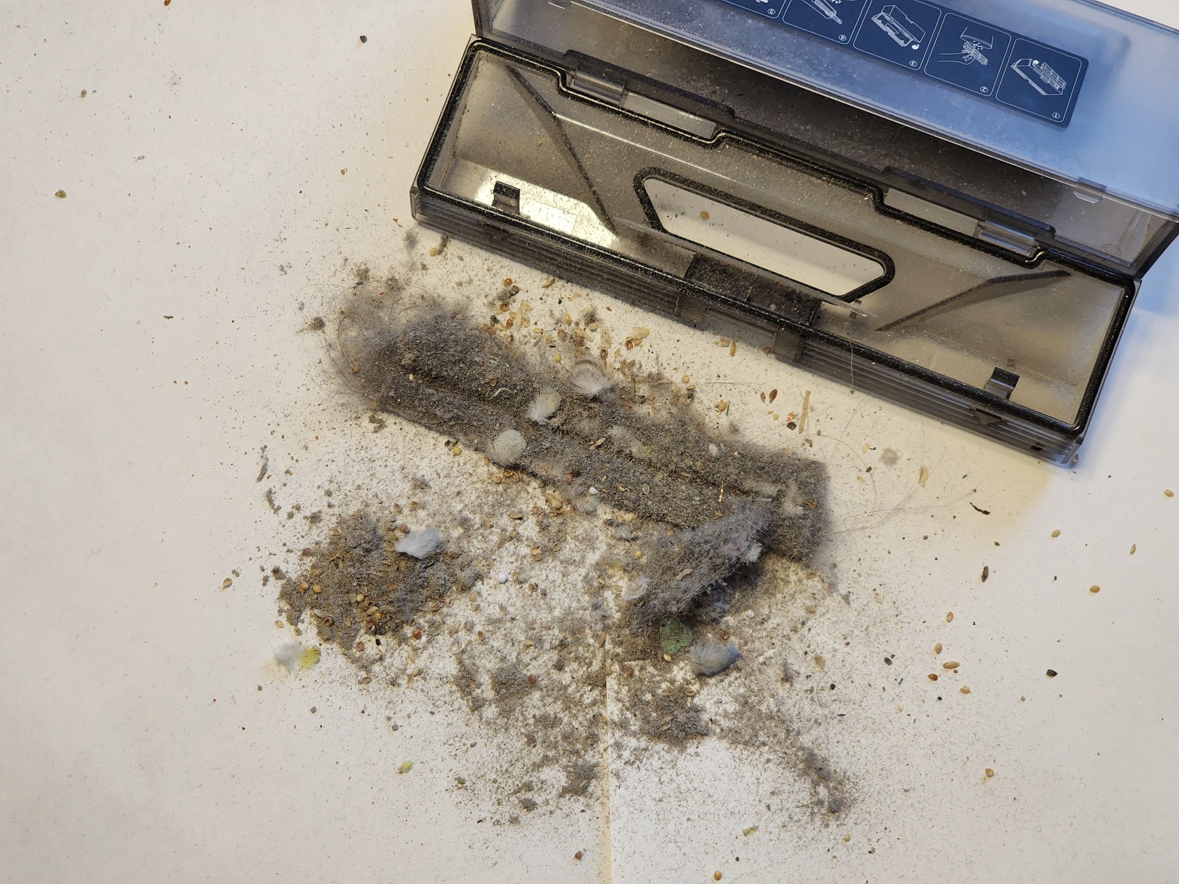 Если пластина для мытья не установлена, то автоматически робот выполняет только сухую уборку. Интенсивность всасывания можно выбрать в приложении, но при автоматическом распознавании мягких напольных покрытий (ковров), робот автоматически увеличивает мощность. Результат довольно неплохой — собирает крупный и мелкий мусор, волосы и шерсть животных, а самое главное — много мелкодисперсной пыли, что зачастую не под силу недорогих моделям. На фото «улов», который робот собрал в чистой комнате, в которой «катается» другая, более простая модель робота-пылесоса. Так что можно смело делать правильные выводы.