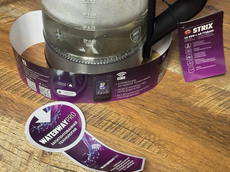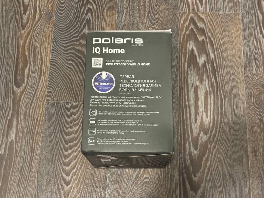 При распаковке сразу создаётся впечатление, что это не бюджетная модель, хотя стоимость устройства очень демократичная. Коробка полностью черная и выгядит очень стильно. Выполнена из плотного картона с качественной цветной полиграфией, на передней части красочно изображен сам чайник и указана основная информация о об устройстве, включая поддержку Wi-Fi и возможность работы в системе «умного дома», а также трех летняя гарантия. На боковой гранях коробки рассказано про запатентованную технологию крышки. Сверху прсутствует пластиковая ручка для удобства переноски.