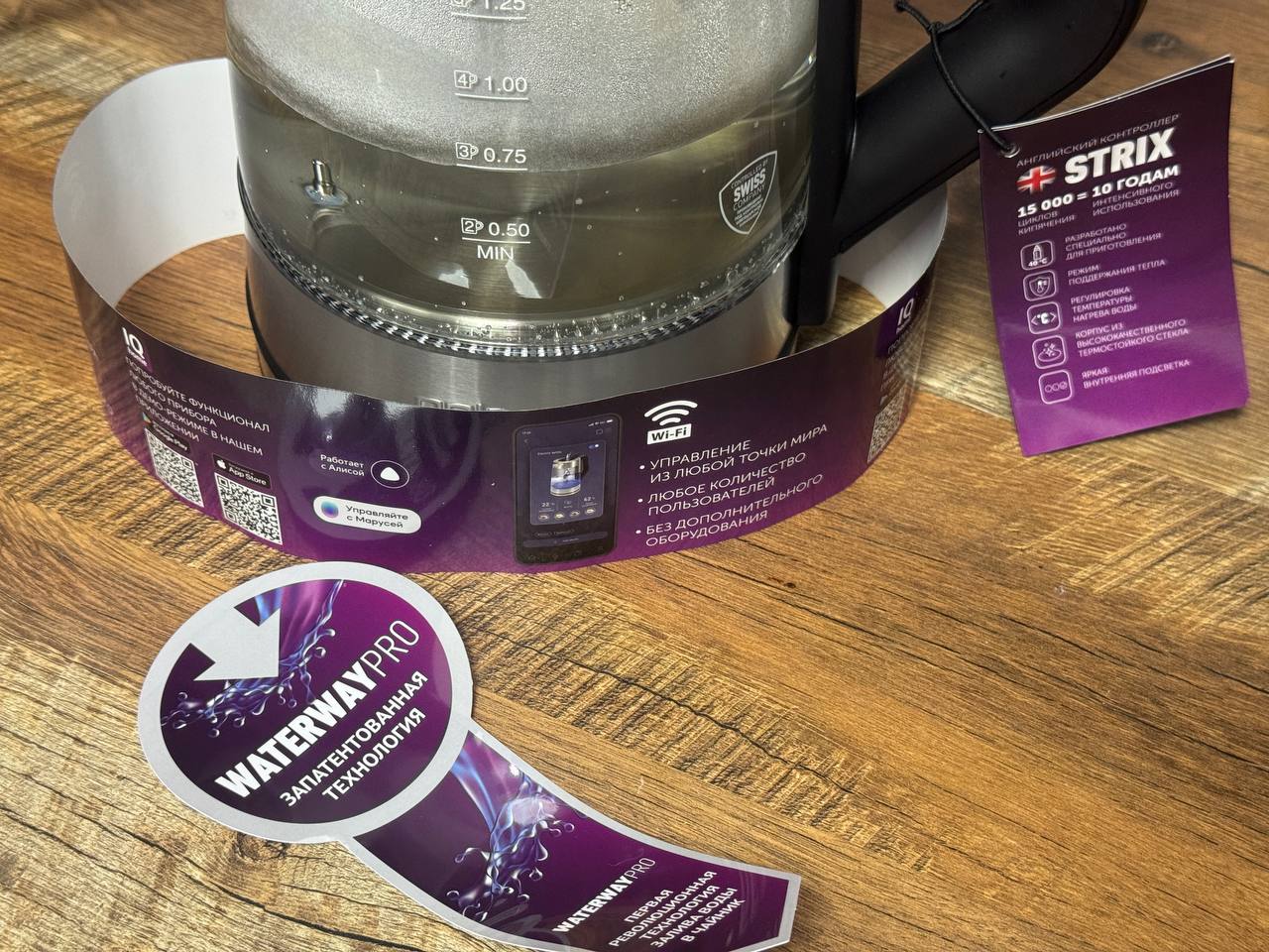 Комплектация стандартная: чайник, база и документация. Отдельно лежит фирменная крышка, которая позволяет заливать воду без снятия и открывания. В остальном никаких «сюрпризов» вроде дополнительных фильтров или запасных частей. С другой стороны сам чайник и внутри и снаружи «брендирван» этикетками с маркетинговыми обозначениями. Производитель заявляет до 10 лет работы, что действительно много для электрочайника.