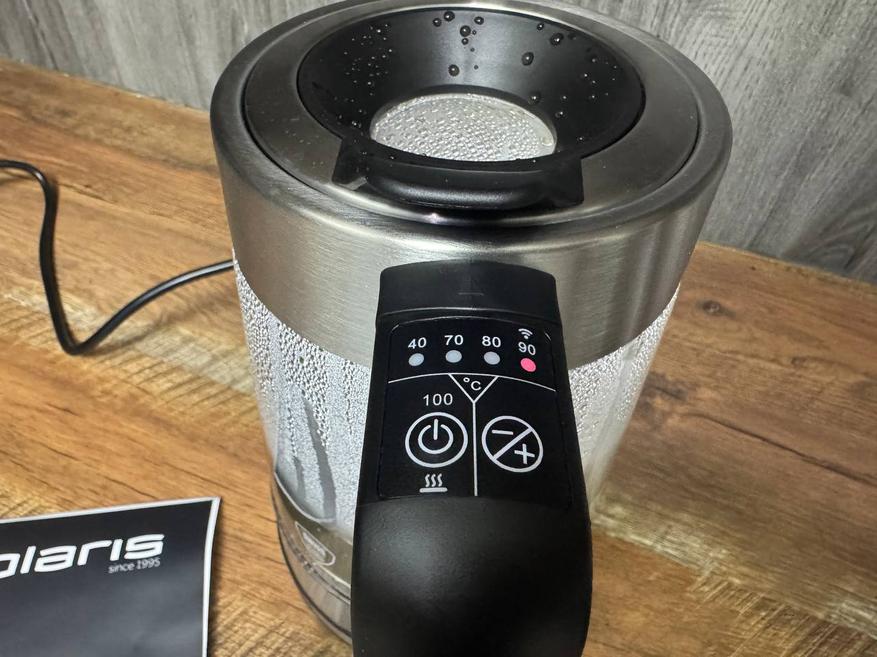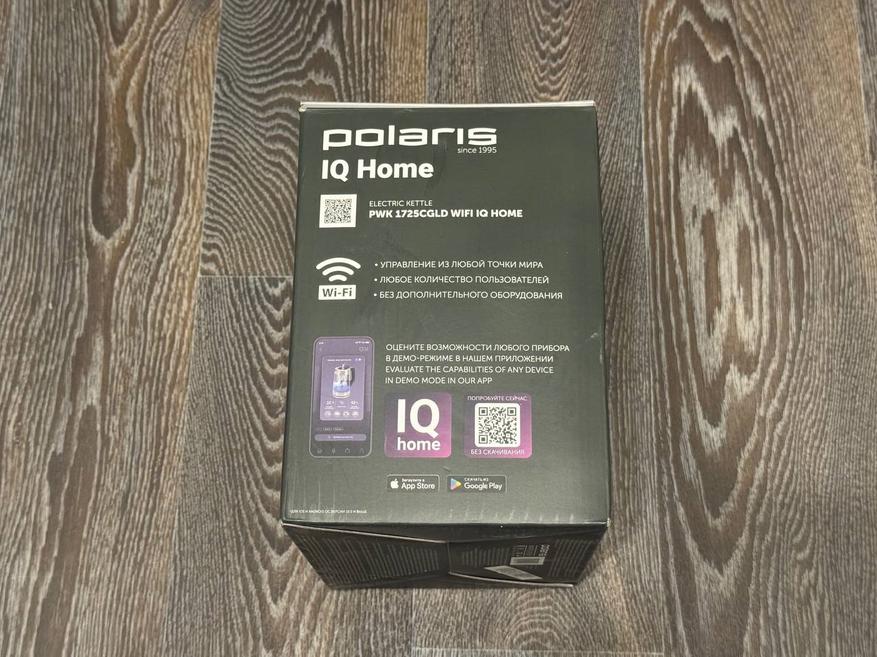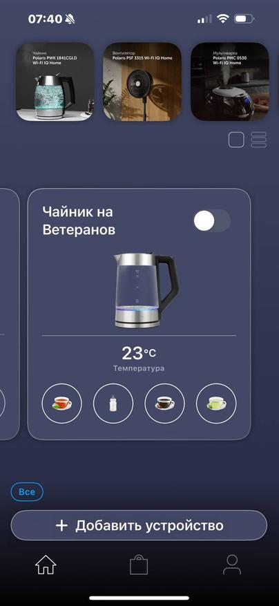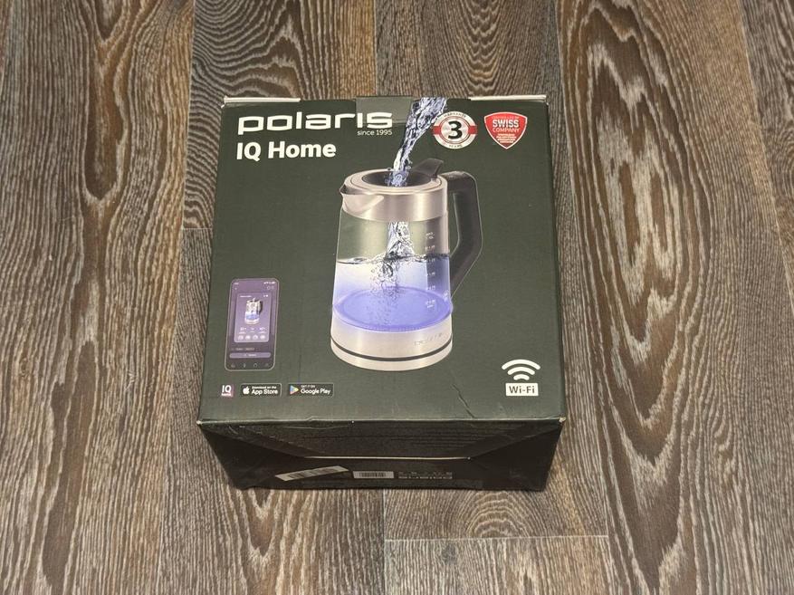 Основная особенность модели заключается в поддержке Wi-Fi и возможности управления через приложение Polaris IQ Home. Подключение проходит очень просто. После включения чайника нужно удержать на нем кнопку (+/-) до звукового сигнала, выбрать в прилоджении свою сеть, работающую в диапазоне 2,4 ГГц и ввести пароль. После этого устройство начнет подключение и появляется в приложении.