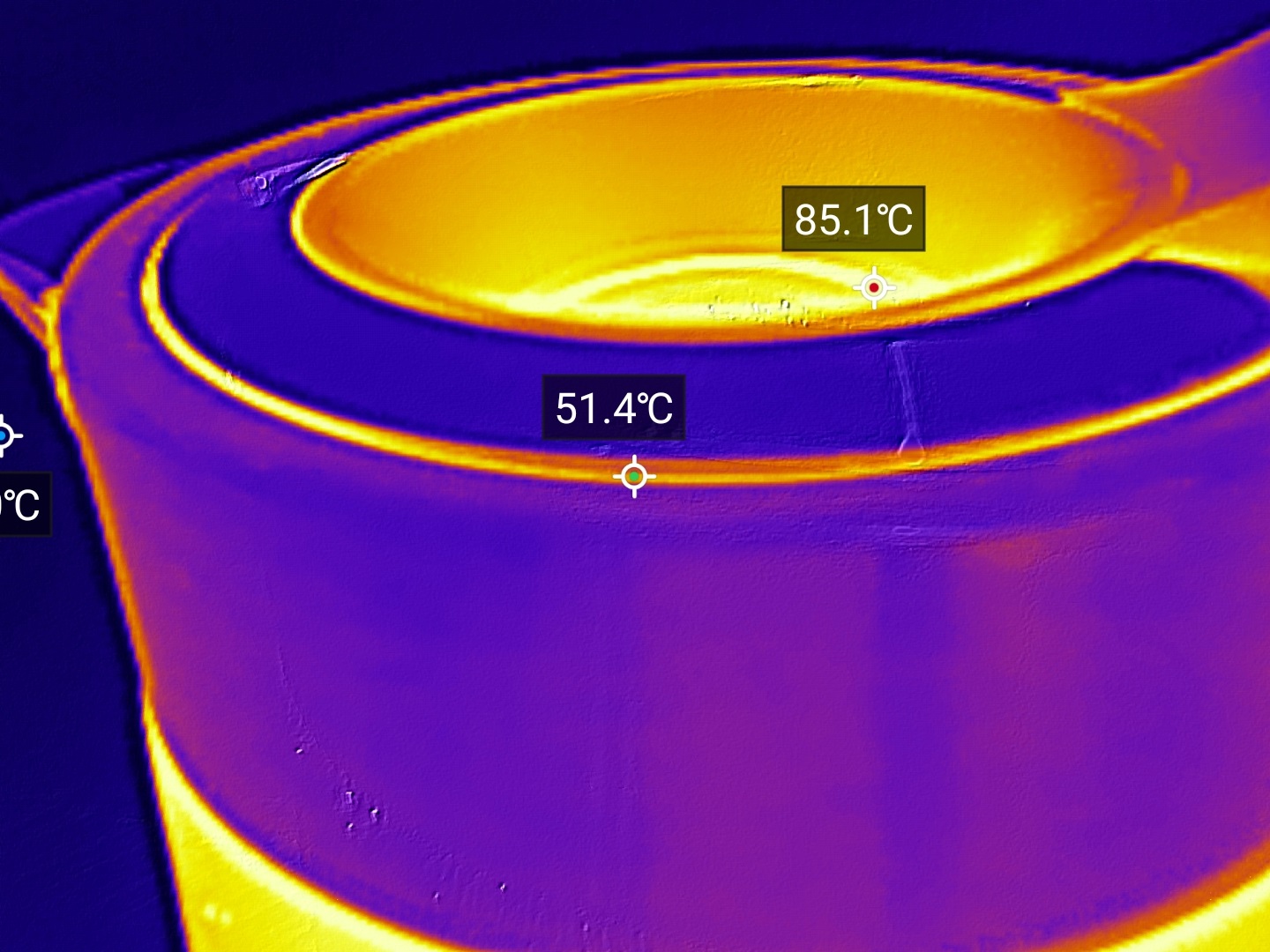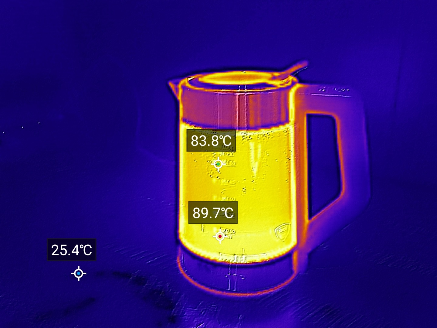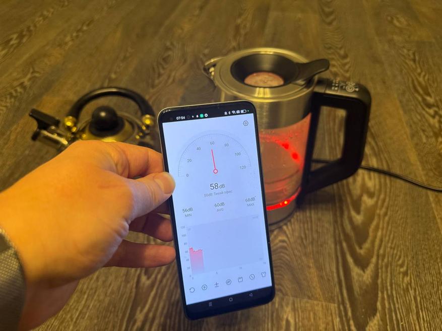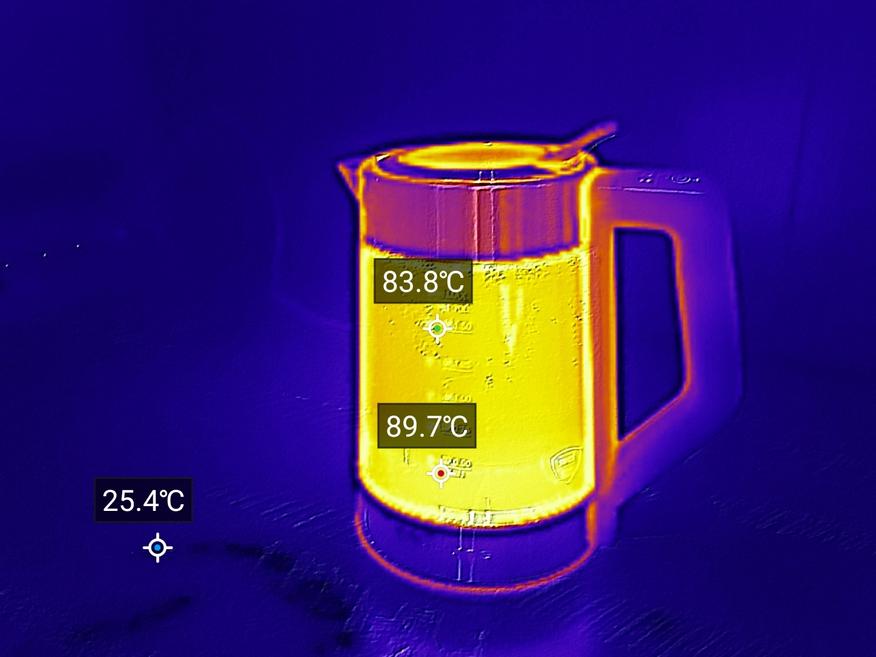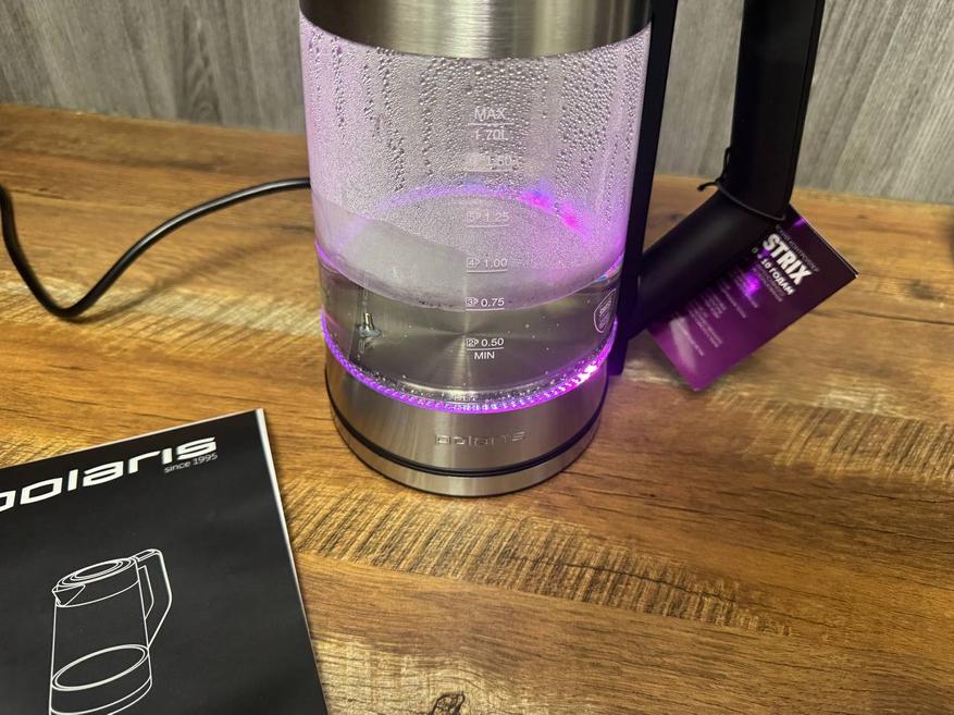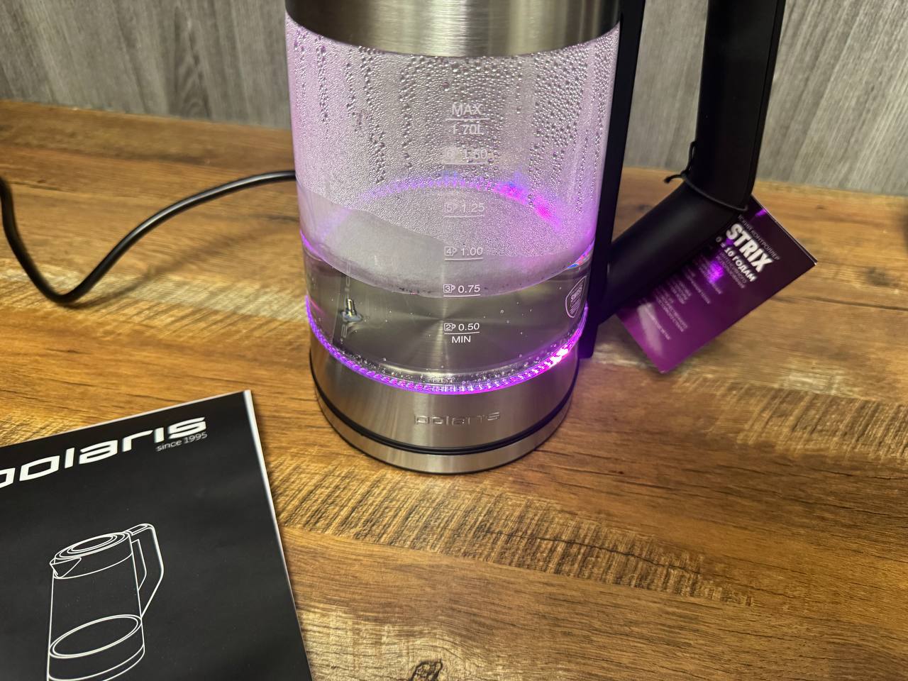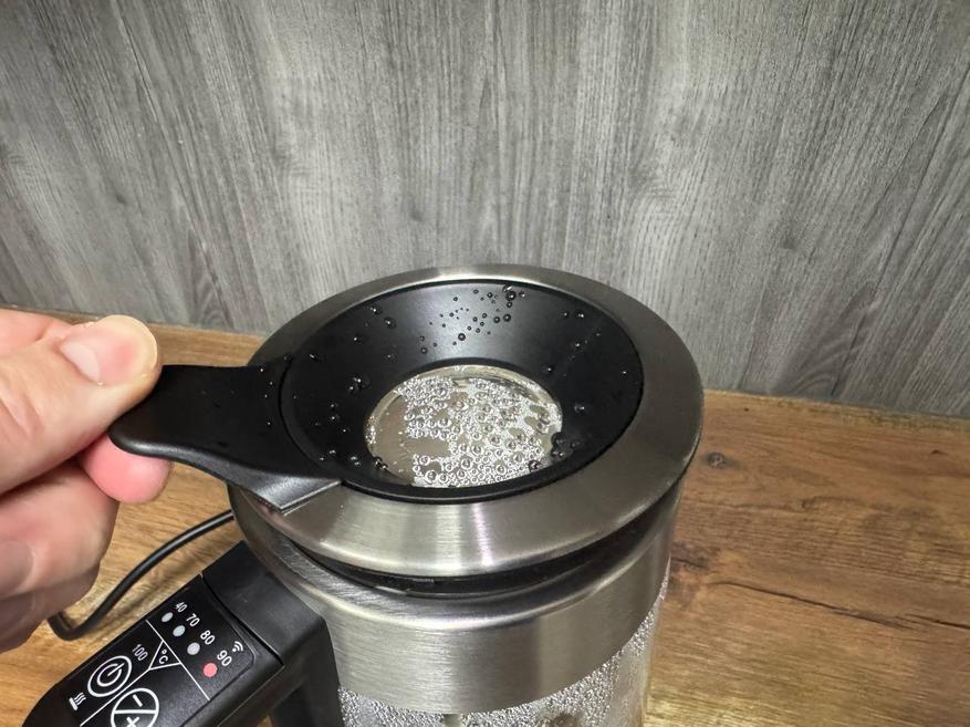 Чайник работает достаточно тихо, нагревает воду быстро и равномерно. Уровень шума при закипании редко превышает 60 дБ. Наполненный проточной водой чайник (1,7 литра) вскипел за 6 минут. Также вскипятил 0,7 литров, который вполне хватит на две чашки чая или кофе. Нагрев занял без малого 3 минуты. Подсветка во время кипячения мягкая, не раздражающая. Возможность выбора температуры и её удержания действительно полезна, особенно при заваривании кофе или различных видов чая. Режим поддержания температуры позволяет не следить за процессом во время вечеринок и застоилий и пользоваться горячей водой по необходимости. После разогрева стеклянная колба и верхняя металлическая часть веьма горячие и к ним лучше не прикасаться, а вот нижняя часть самого чайника остается холодной.