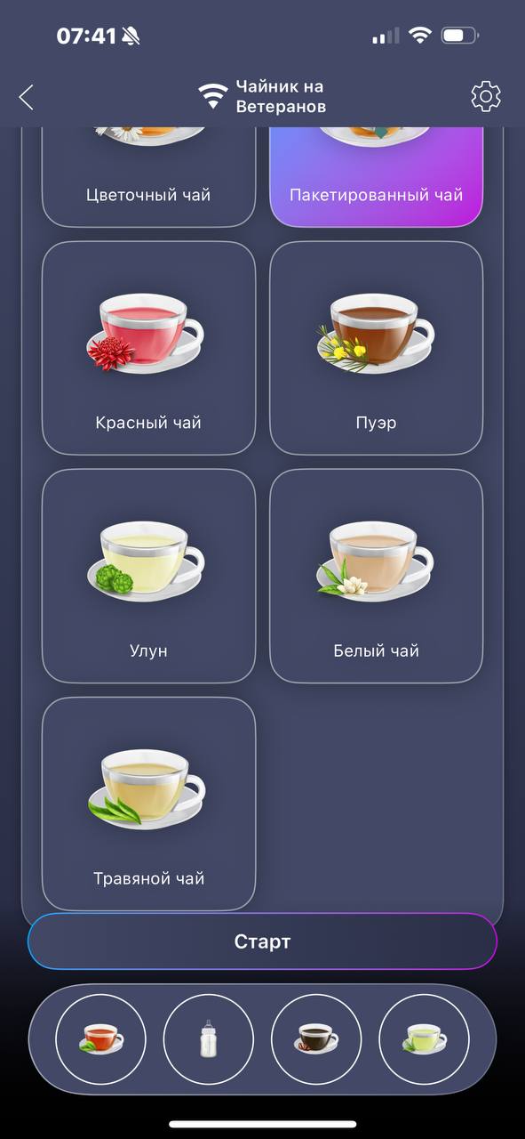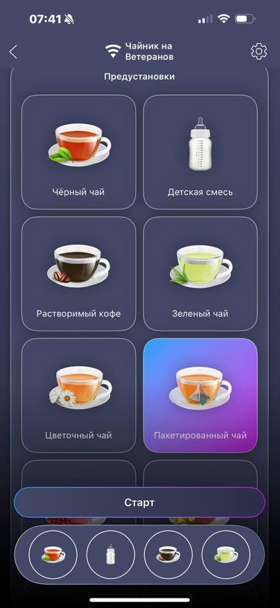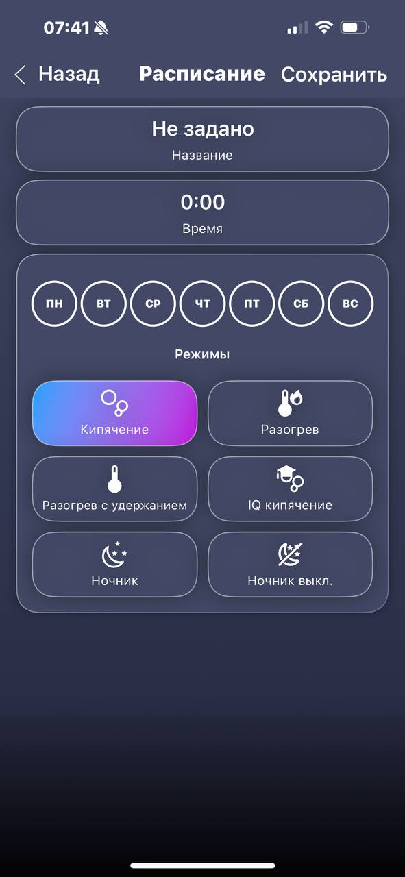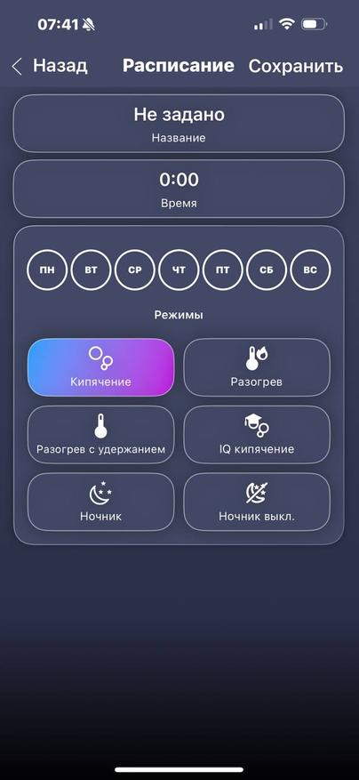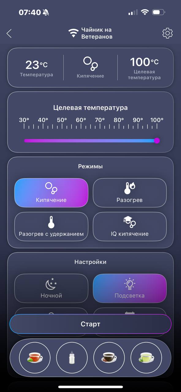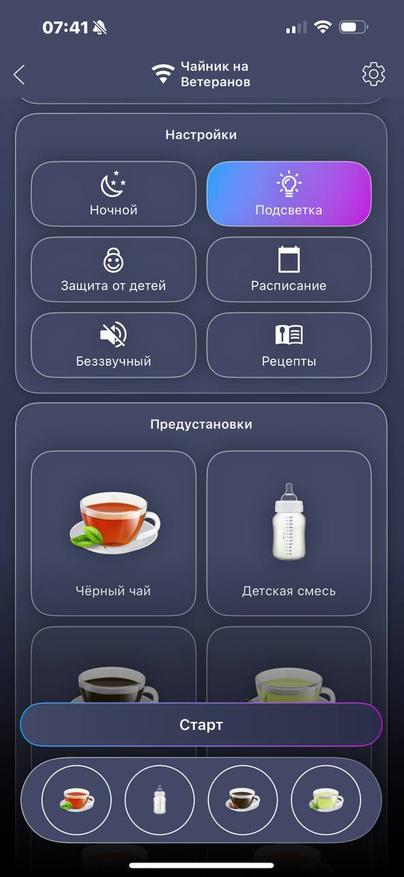 В приложении можно включить и изменить цвет подсветки, посмотреть и задать температуру нагрева чайника, выбрать режим кипячения, в том числе для заваривания разных видов чая. Достаточно просто нажать на нужную плашку и чайник сам разогреет воду для заваривания выбранного сорта чая, кофе или детского питания. Также можно выбрать режим разогрева с удержанием температуры или IQ кипячения, при котором вода будет доводиться до кипения постепенно, сохраняя при этом полезные свойства и кислород в воде. Еще можно задать расписание нагрева, чтобы получать кипяченую воду к вашему пробуждению, приходу с работы или других сценариях.