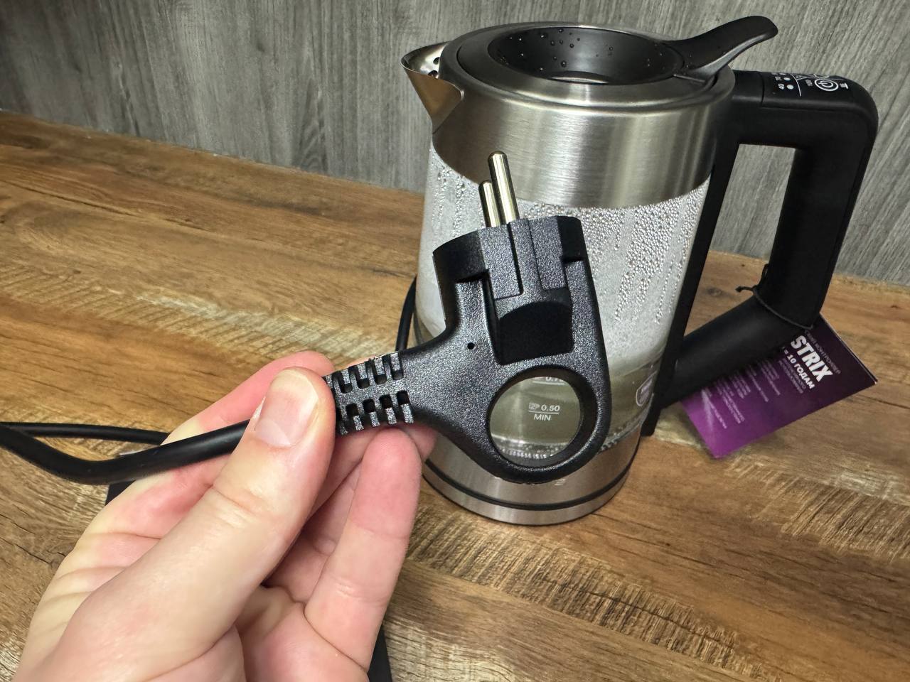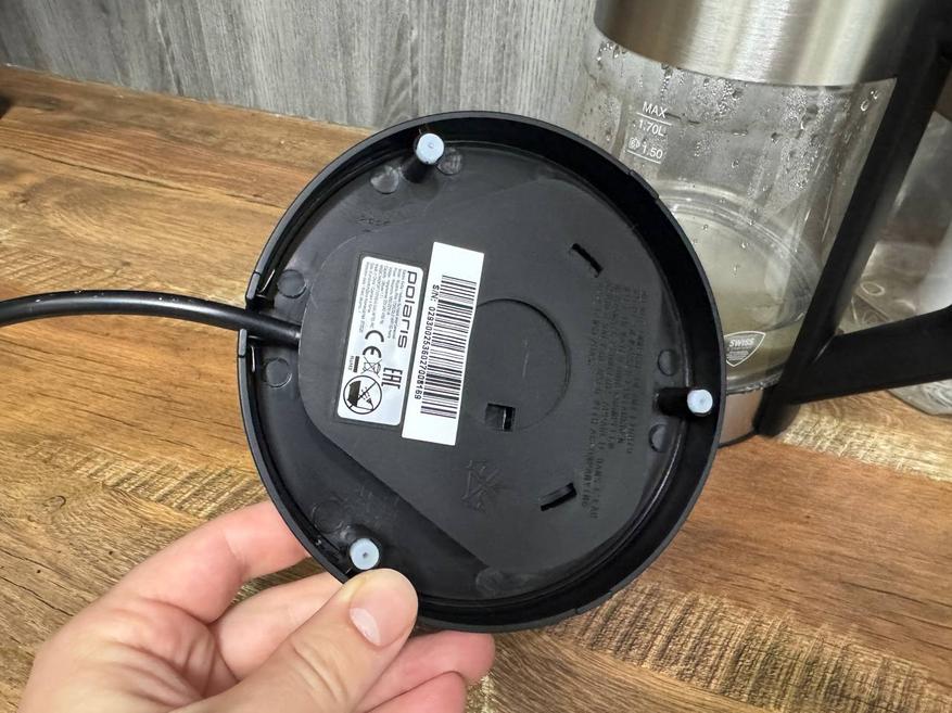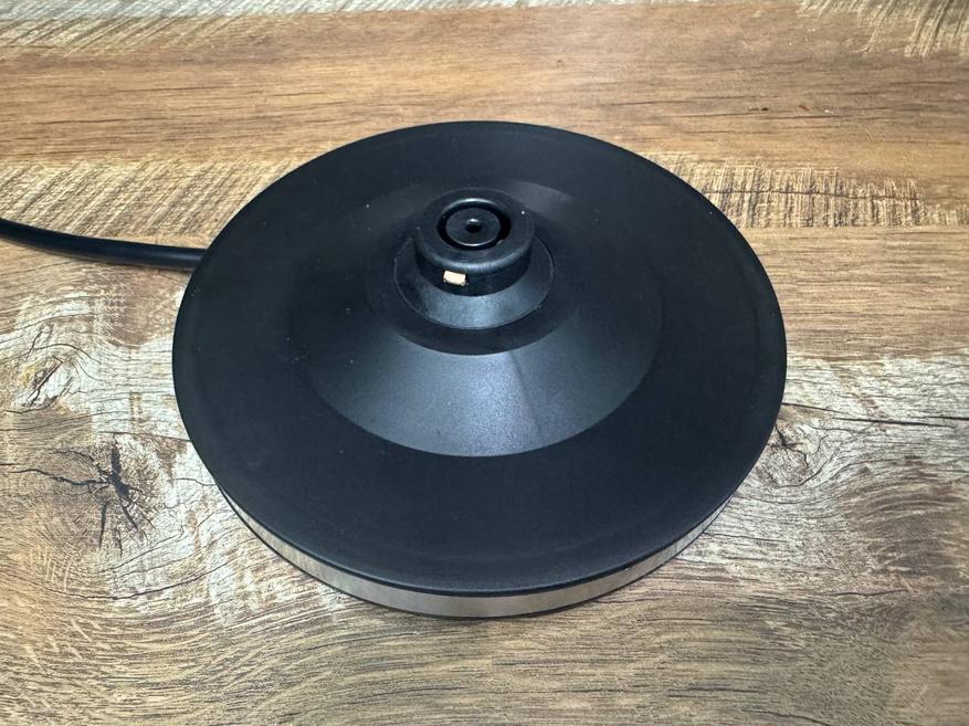 Основание надёжное, контактная группа STRIX работает имеет защиту от влаги и выглядит очень уверенно. Помимо качесвтенного плотного платика и отлично выполненых контактов стоит отметить и металлическую составляющую, которая обрамляет базу. Чайник можно ставить в любом положении. Конструкция позволяет поворачивать его на базе без ограничений — тут все стандарто. Снизу присутствует зацепы для кабельменеджмента и три силиконовые ножки, которые очень хорошо держат базу на поверхности столещницы — особенно под вестом чайника с водой. Ножки имеют отверстия в центре, благодаря чему они как бы присасываются к столешнице.