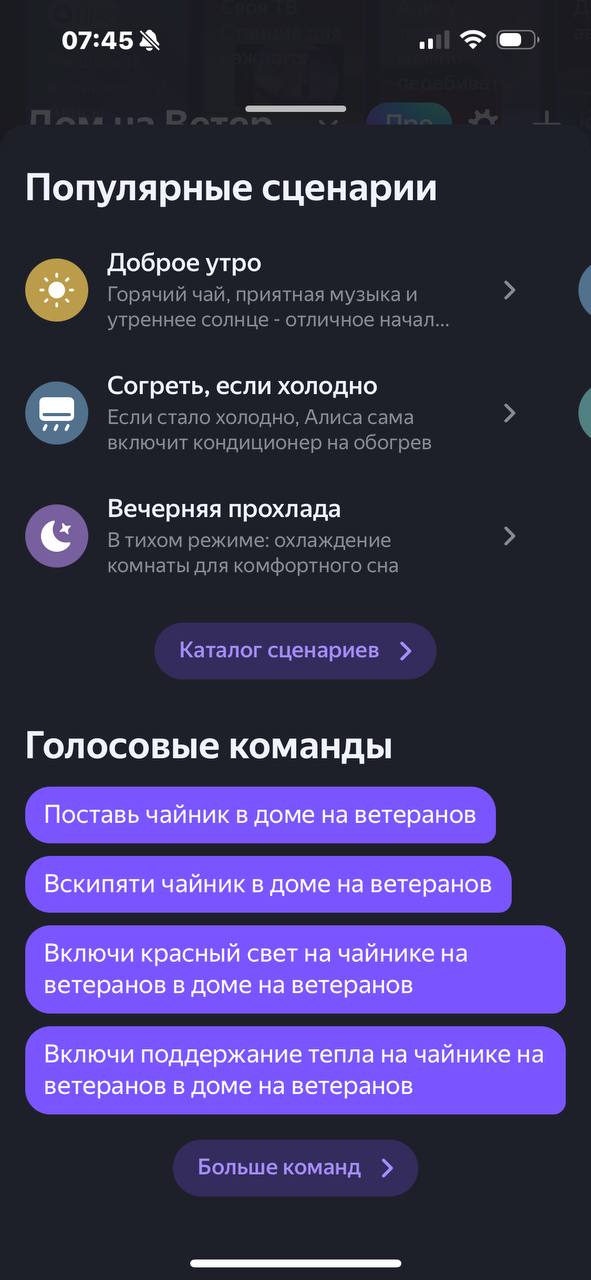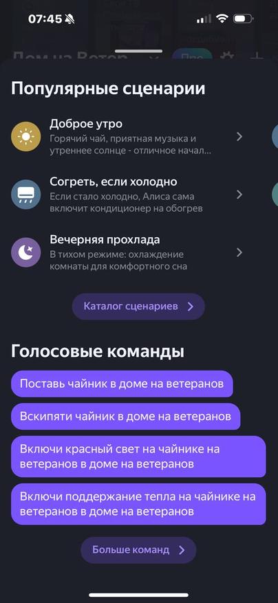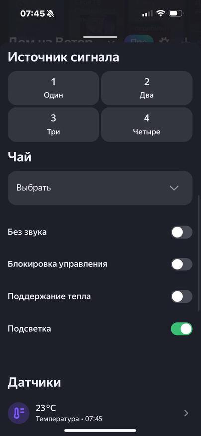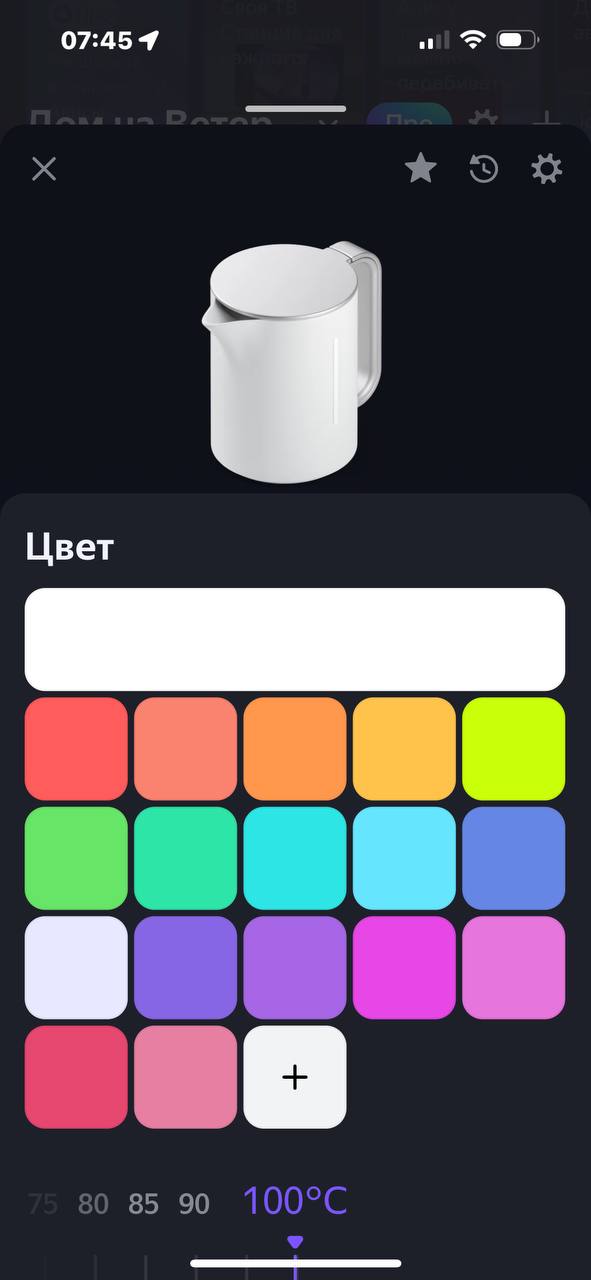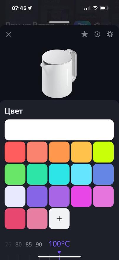 Также простая команда: «включи подсветку чайника» не работает и активирует нагрев до заданной темературы. Чтобы бездушная программа поняла вас, нужно сказать волшебное слово, но не пожалуйста, а именно цвет подсветки. То есть: «Алиса, включи подсветку чайника фиолетовым».