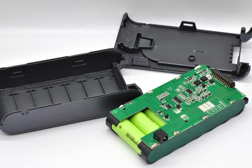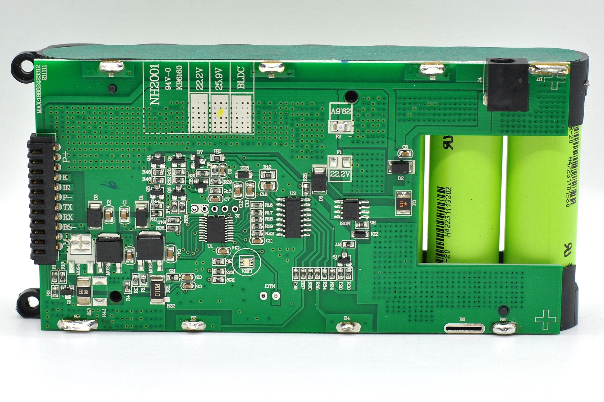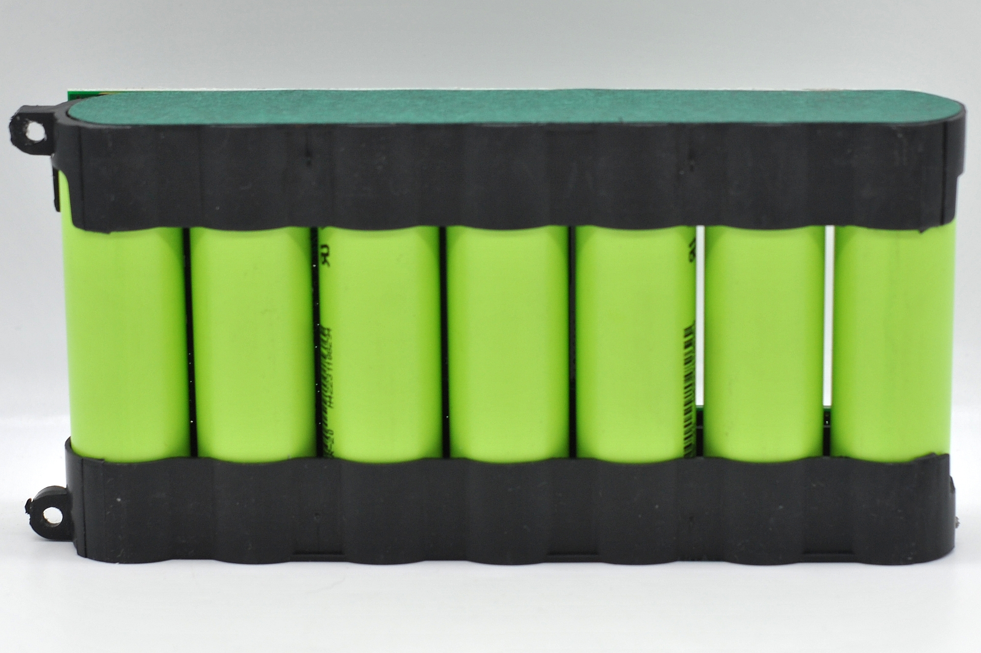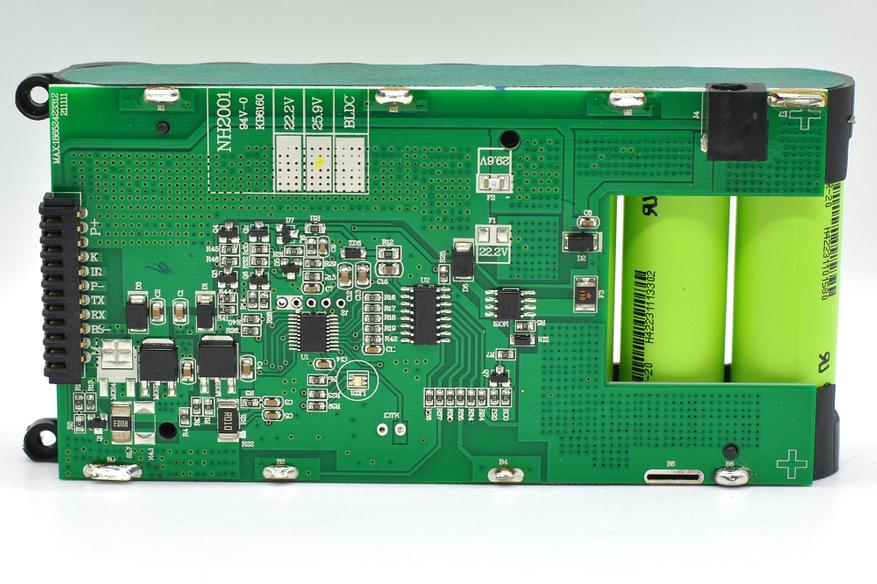 Для питания используются семь последовательно соединенных высокотоковых элемента 18650 (общее напряжение 25,9 В, ёмкость 2 Ач). На плате есть балансировка поэлементно, что продлит срок эксплуатации аккумуляторной сборки.