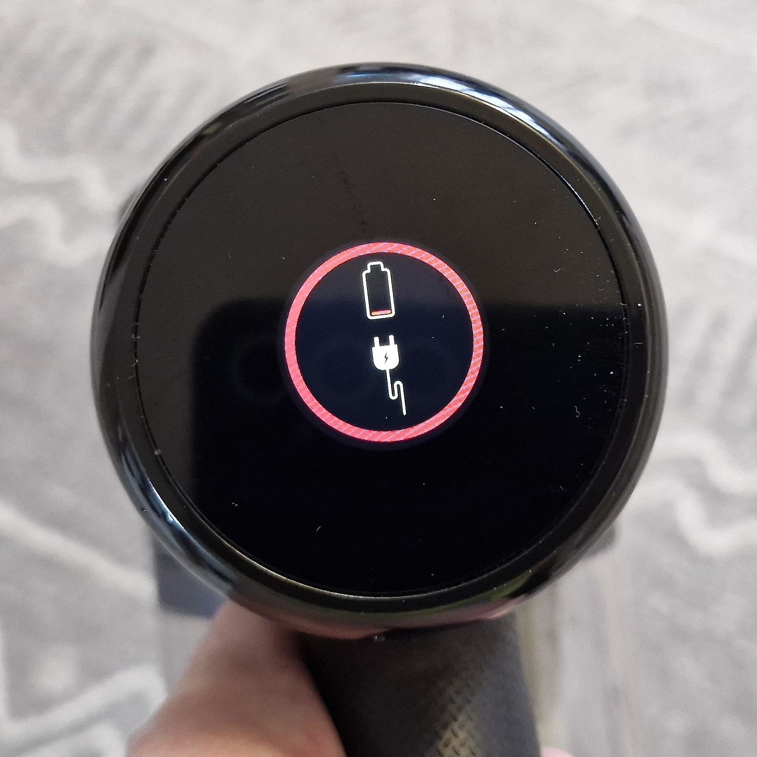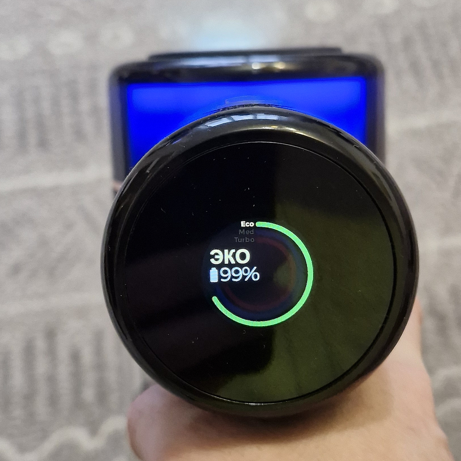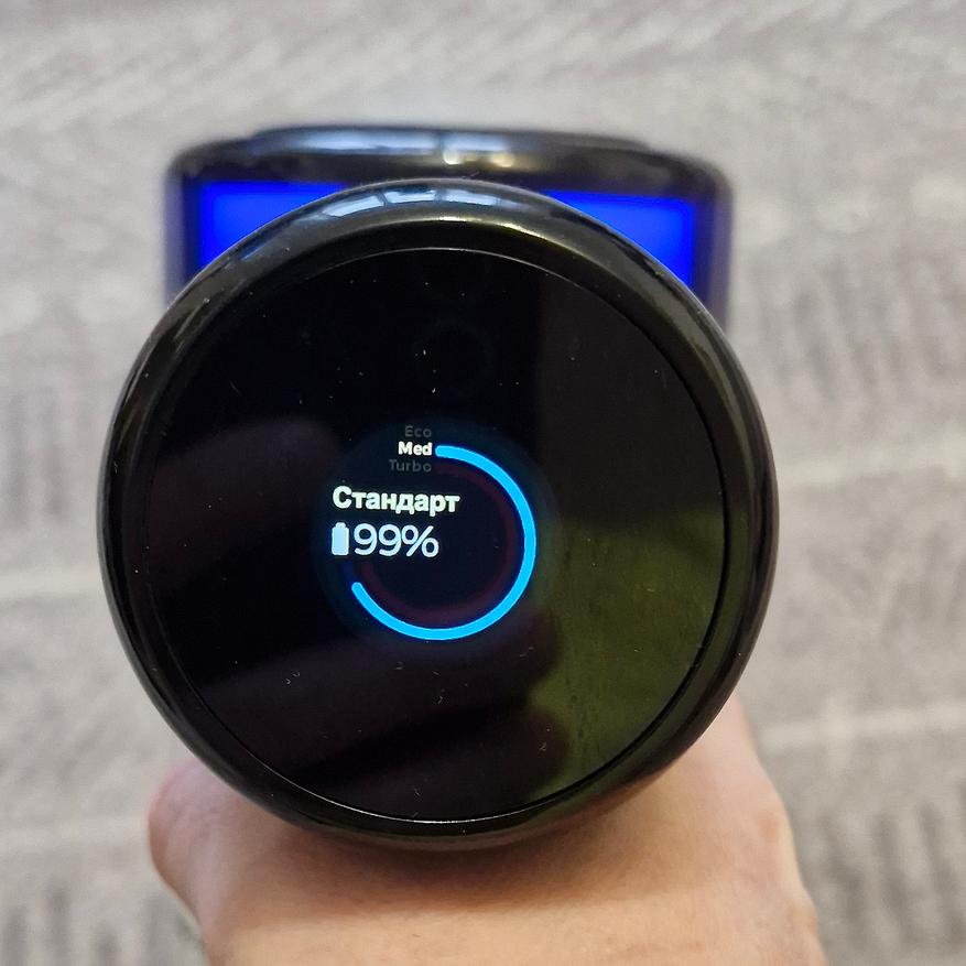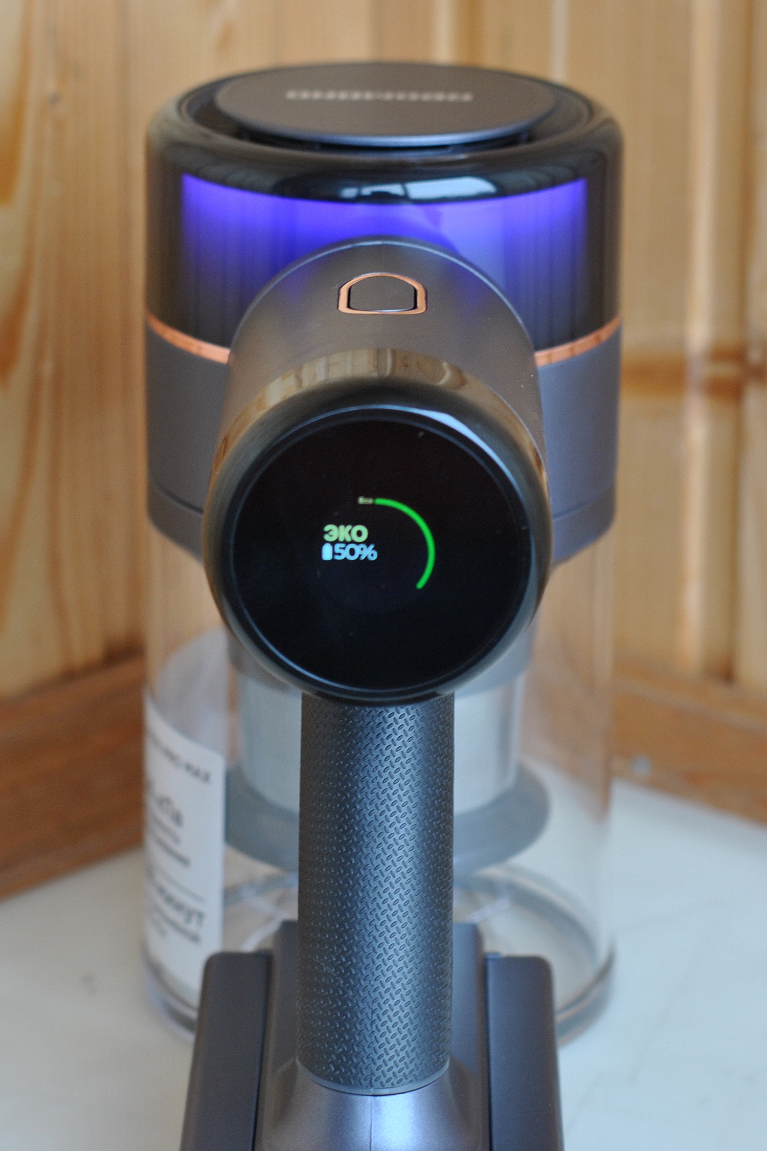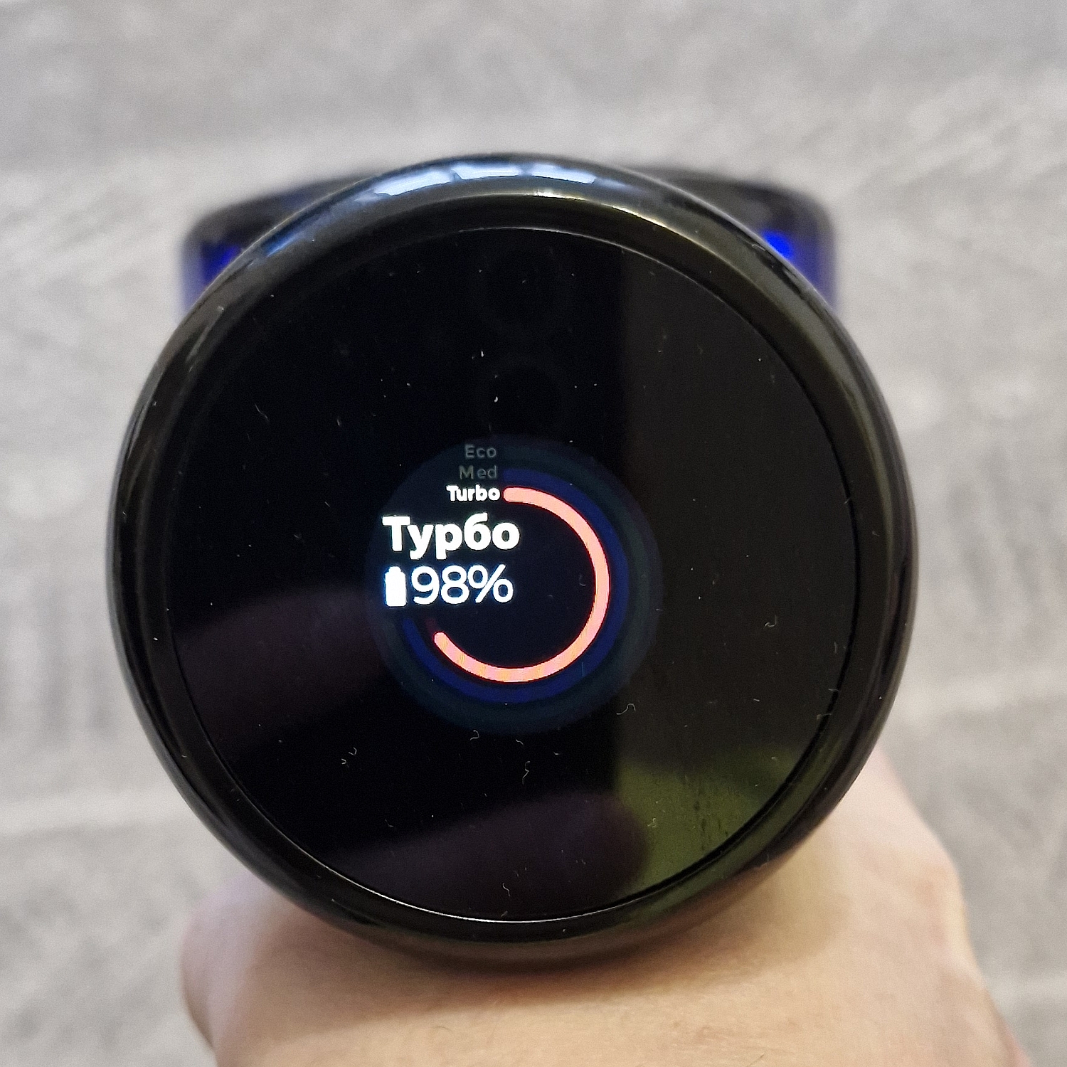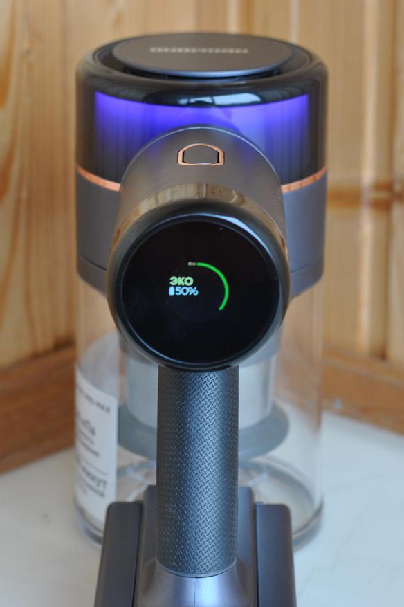 Помимо кольцевого индикатора на дисплее и цифр, оставшийся заряд показывается цветом подсветки верхней части корпуса пылесоса (синяя, фиолетовая, красная). Наглядно.