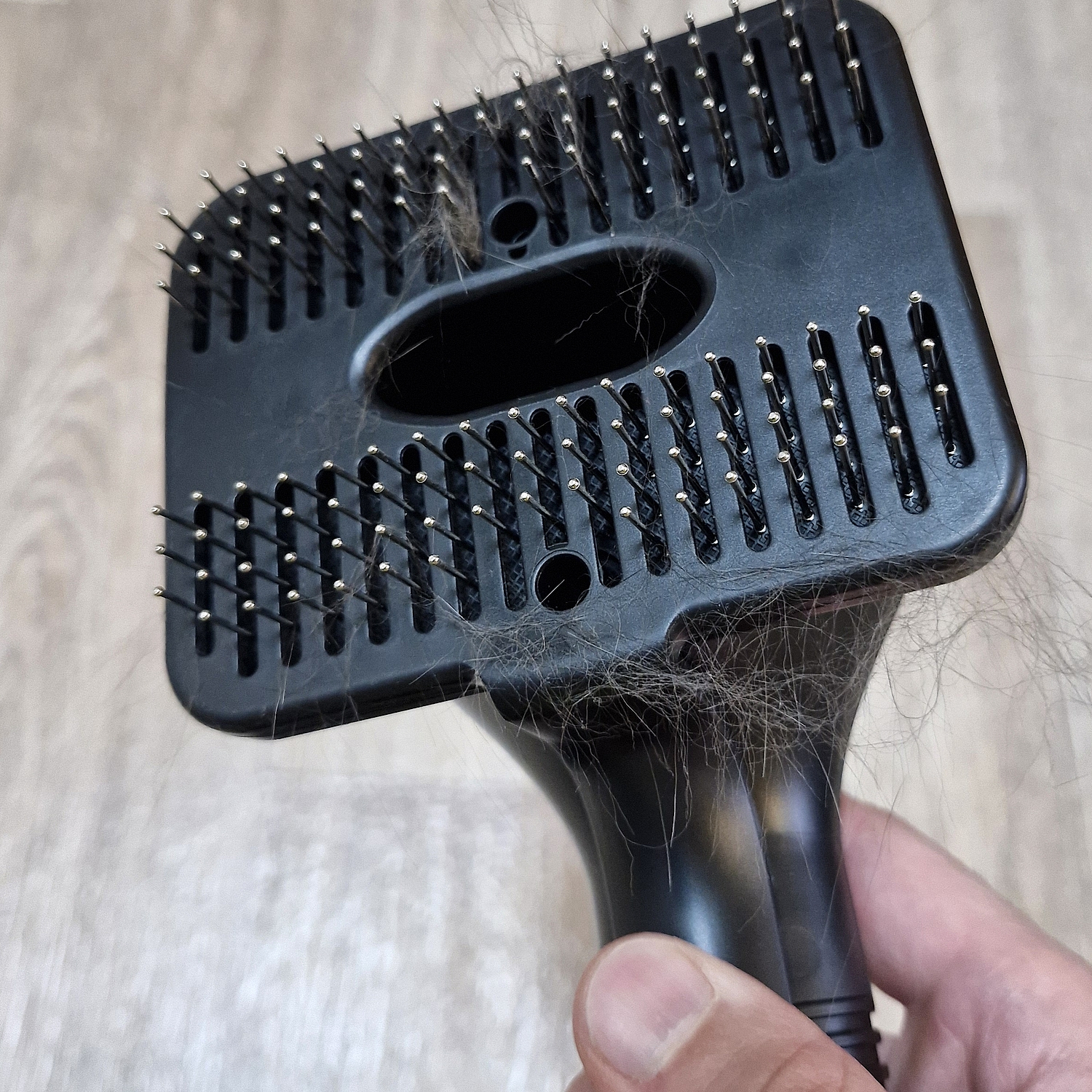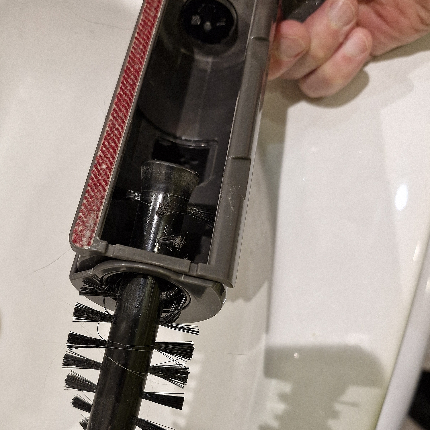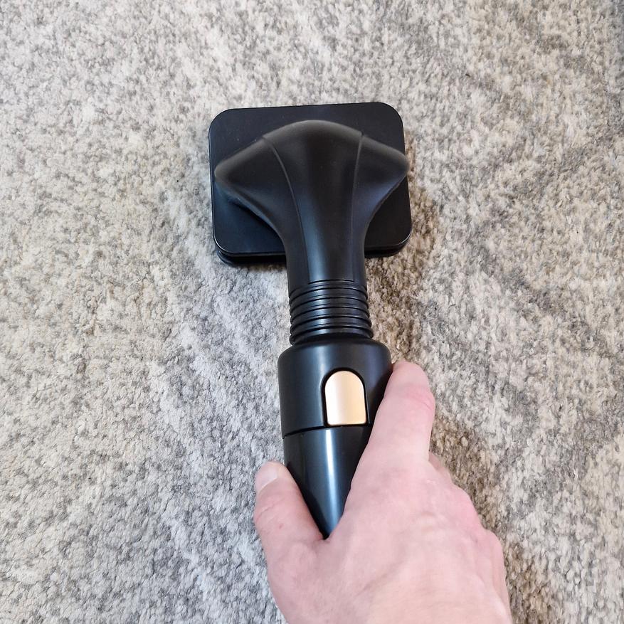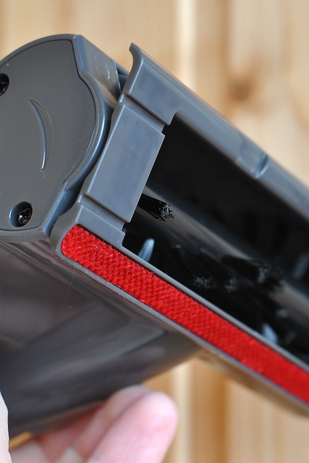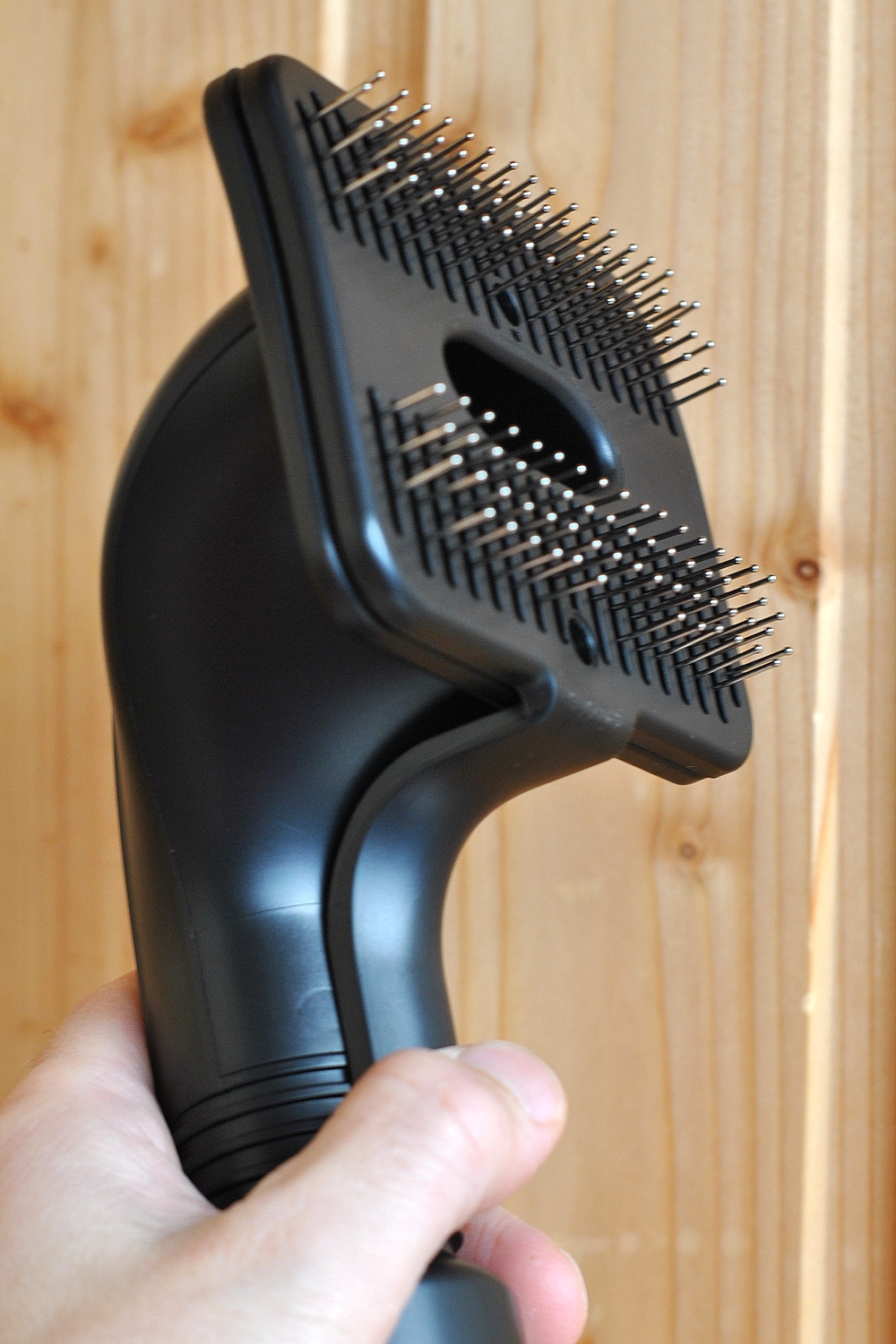 Щетка с пружинным механизмом очистки подходит как непосредственно для груминга животных, так и для очистки ковров. Гибкий удлинитель тянется до 80 см. По моему опыту, на турбощетке для мебели резиновый ролик с пластинками был бы эффективнее щетки.