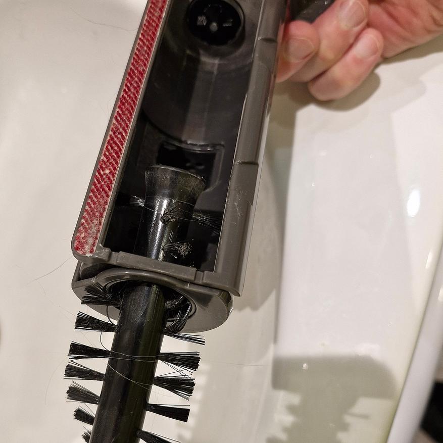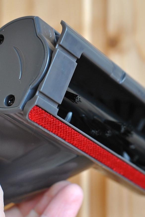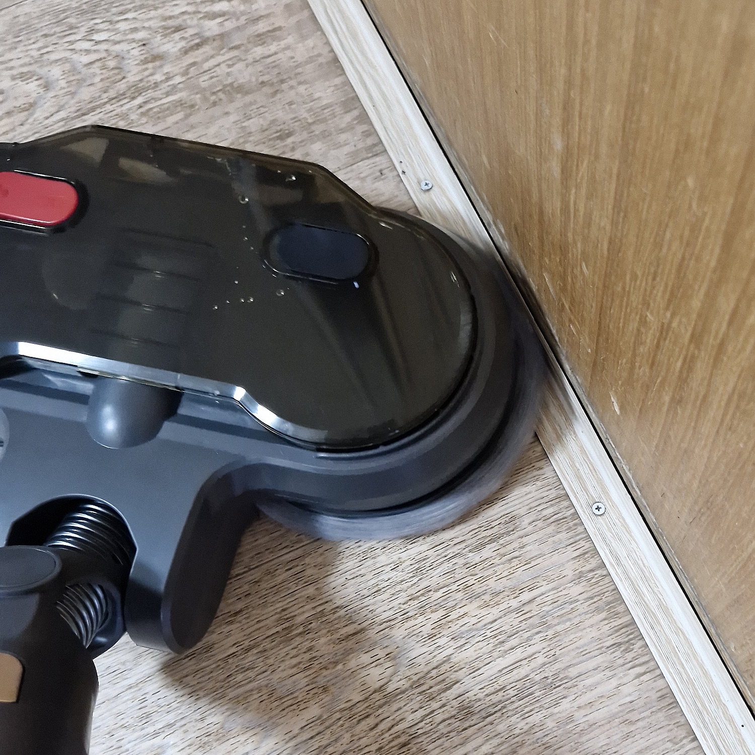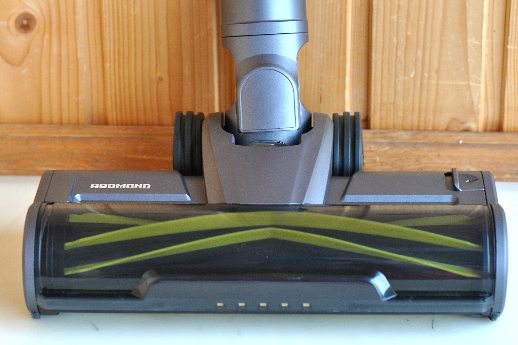 Есть фиксация в вертикальном положении. Основные колесики 62 мм диаметром, вращаются легко. Для подсветки зоны перед щеткой служат 5 белых светодиодов. Из-за блока подсветки на щетке есть выступ примерно 1 см перед рабочей поверхностью щетки.