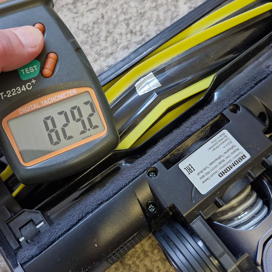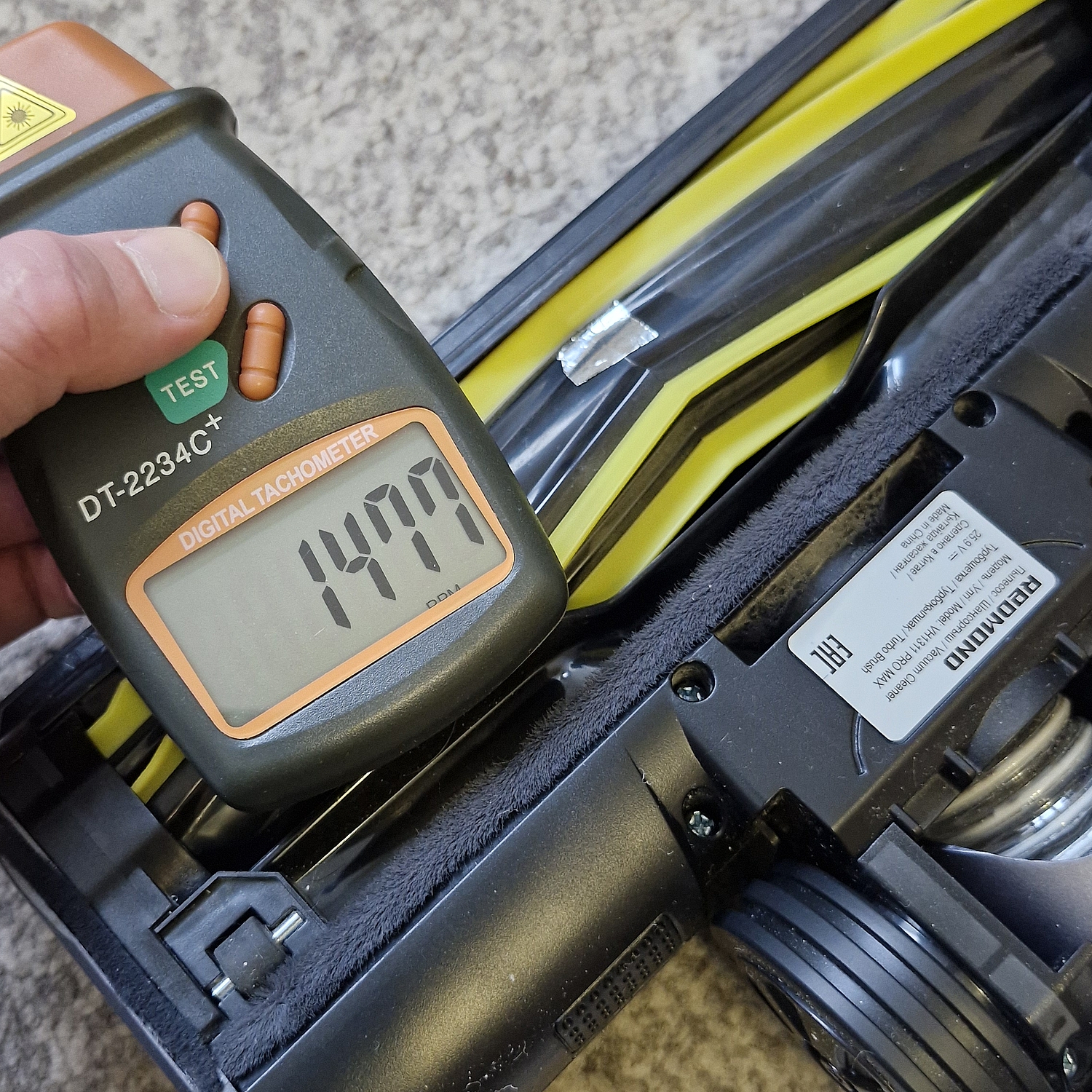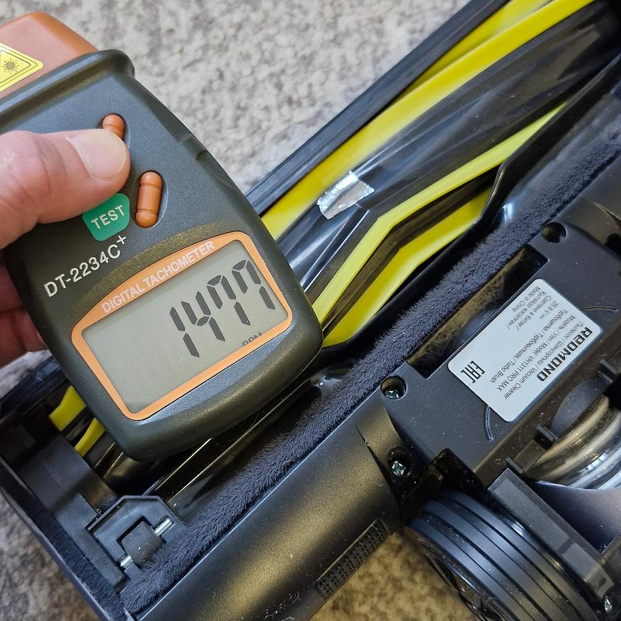 Измерим объективные параметры модели: скорость вращения щетки и шум с расстояния ~1 метр от пылесоса (эко/турбо режим).