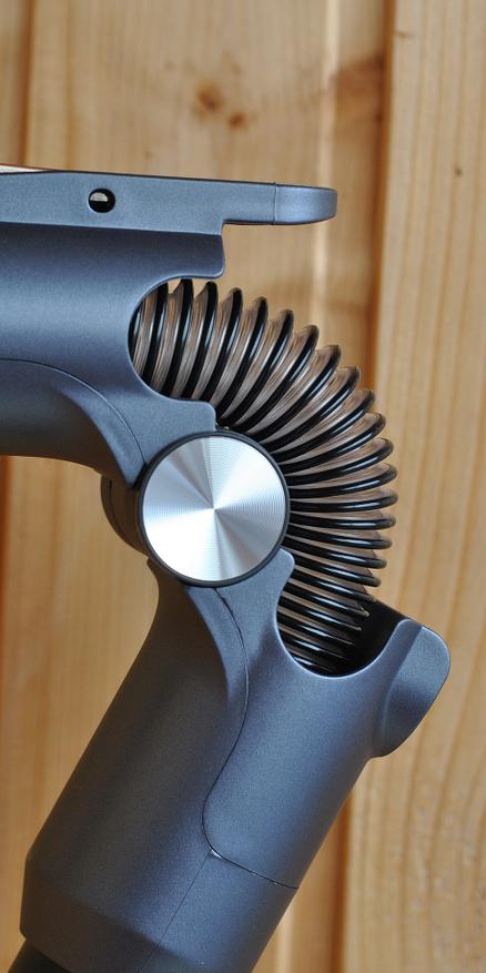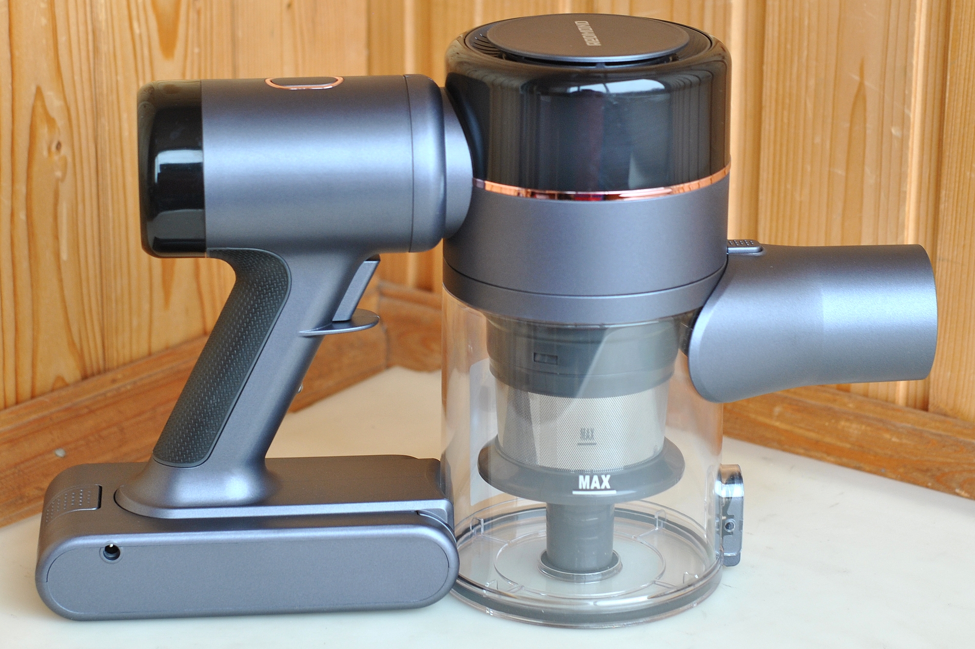 Конструктив блока, который включает электродвигатель, пылесборник и ручку с аккумулятором, довольно привычный. Пластик серый матовый. Есть ухватистая ручка с резиновой вставкой и «курком» включения под указательный палец. Диаметр прозрачного пылесборника 11 см., опорожняется простым откидыванием крышки. Либо можно снять полностью для того, чтобы помыть. В верхней части корпуса размещен выходной воздушный фильтр.