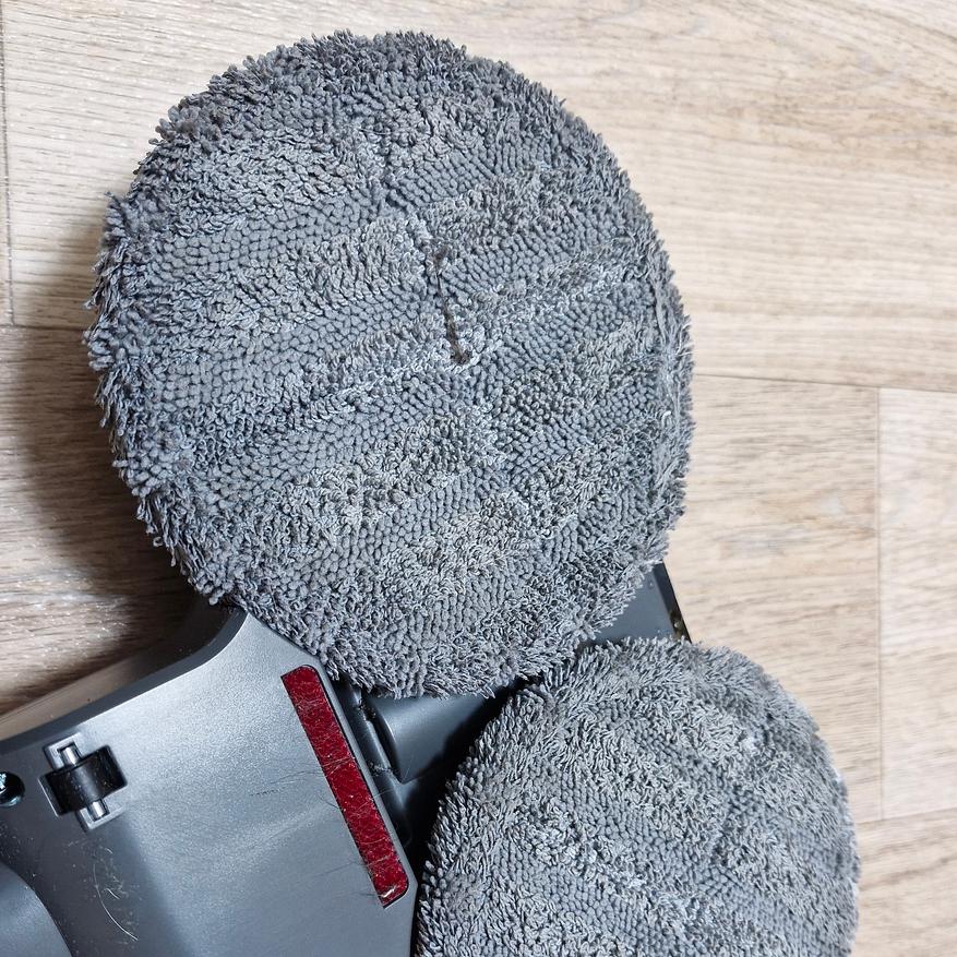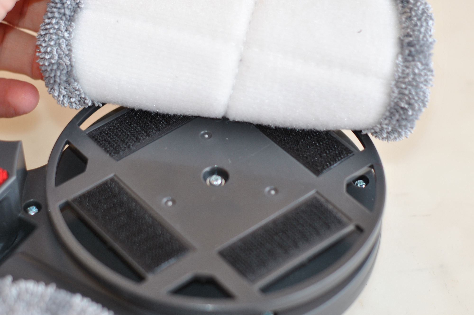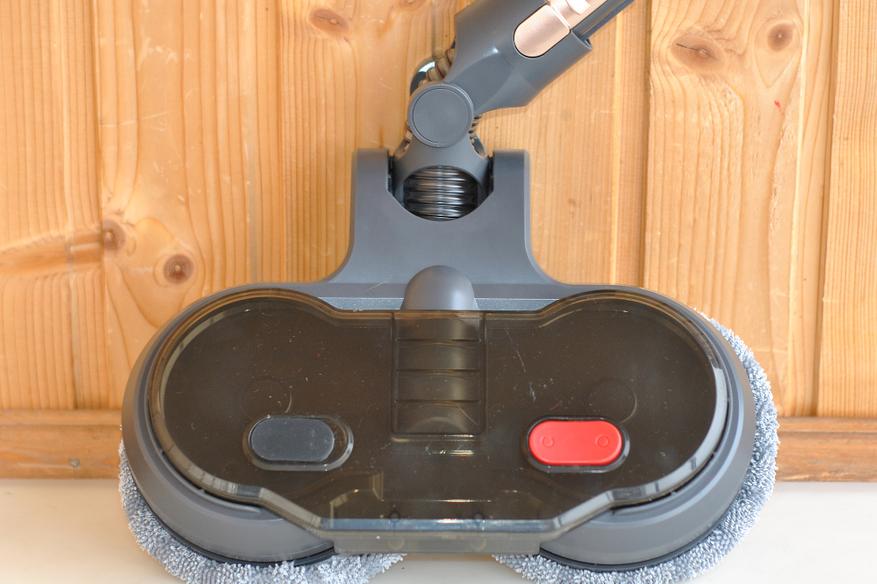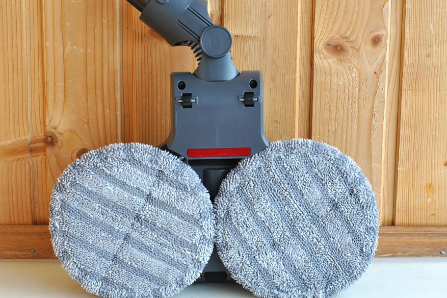 Салфетки съемные (диаметр 15 см), держатся плотно на липучках, довольно плотные (ими можно собрать немного пролитой жидкости). В насадку для уборки заливается примерно 200 мл воды (дают мерный стаканчик). Салфетки вращаются навстречу друг другу. Красная кнопка активирует подачу воды каплями, всасывание пыли при этом продолжается.