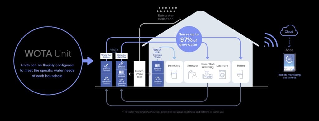 Система WOTA BOX собирает сточные воды из душевых, раковин и стиральных машин, пропускает их через фильтрующие мембраны и химическую дезинфекцию, после чего подаёт обратно для бытовых нужд. Потери компенсируются за счёт фильтрованной дождевой воды. По данным производителя, очищенная вода соответствует японскому стандарту качества питьевого водоснабжения и критериям Всемирной организации здравоохранения.