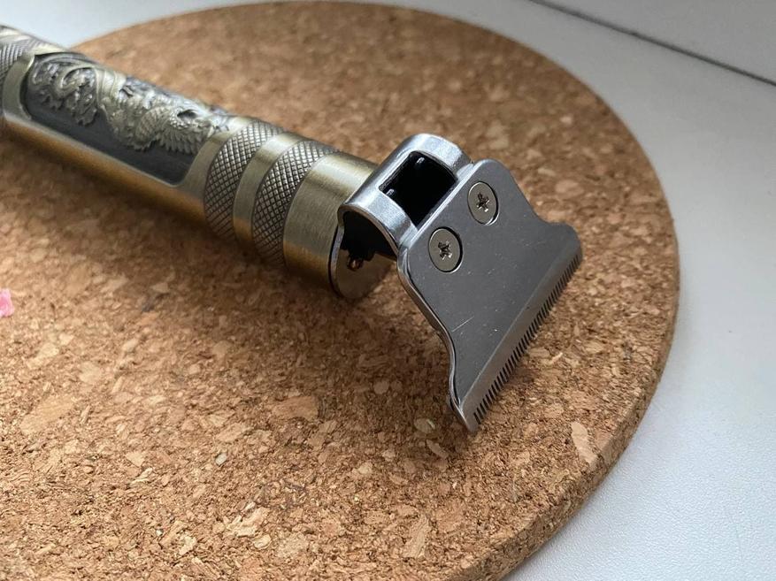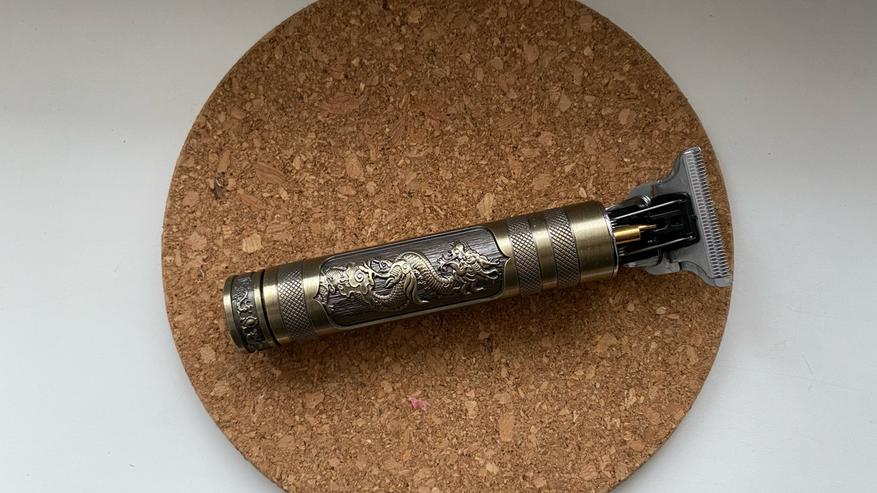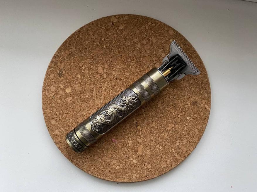 Триммер очень выглядит необычным образом. Корпус изготовлен из алюминия и покрыт рельефным изображением дракона, напоминающий бронзу. Также есть специальная накатка для удобного хвата.