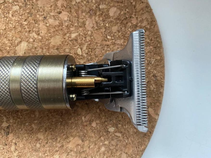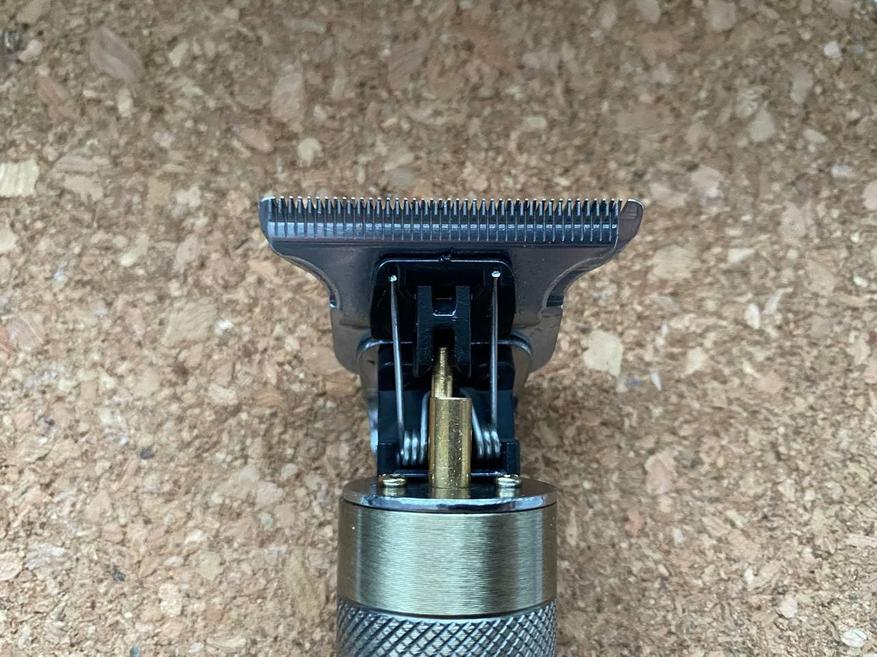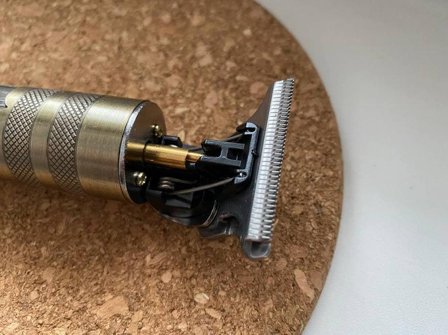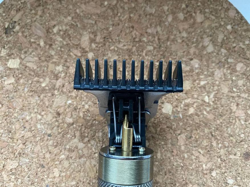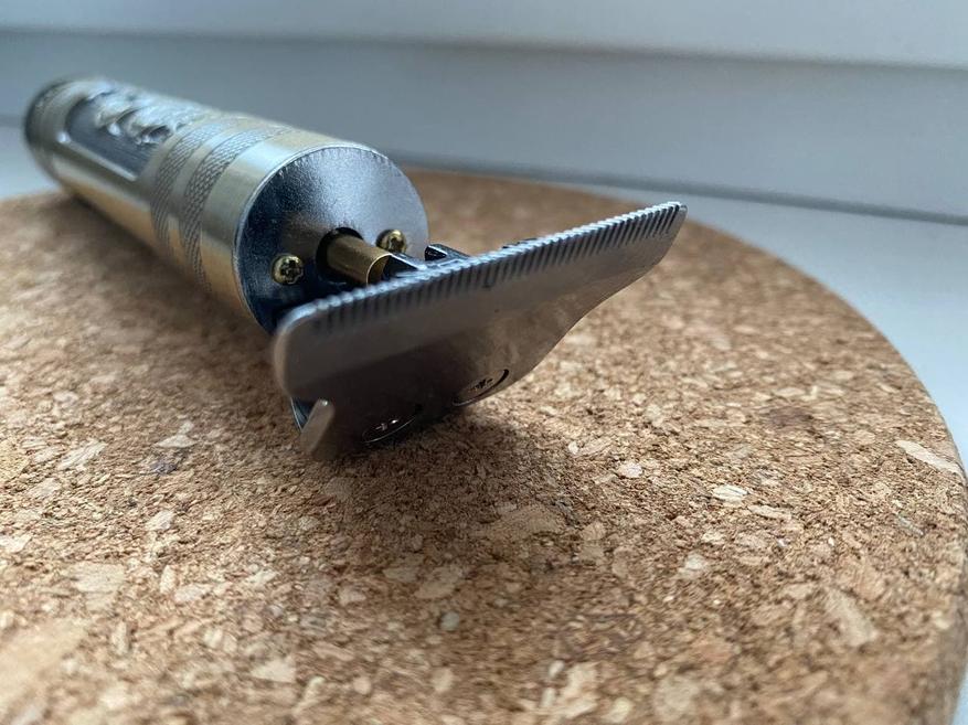 Под насадкой обычный триммер шириной 40 мм. То есть можно сделать окантовку, подровнять виски, а можно и нормально подстричься. Но, с длинными волосами советую быть поосторожнее, так как бронзовый эксцентрик расположилась снаружи и в противном случае может закрутить волосы. Непоправимых бед не наделает – мощность двигателя не та, но неприятные моменты при длинных волосах могут возникнуть, если этого не учесть.