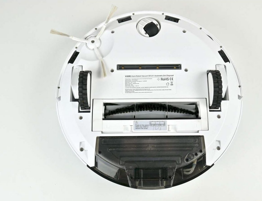 - ведущие колеса, перед которыми находится УФ-лампа, и рабочий блок с адаптивной турбощеткой (она снабжена лепестками и щетиной, оба торца снимаются);