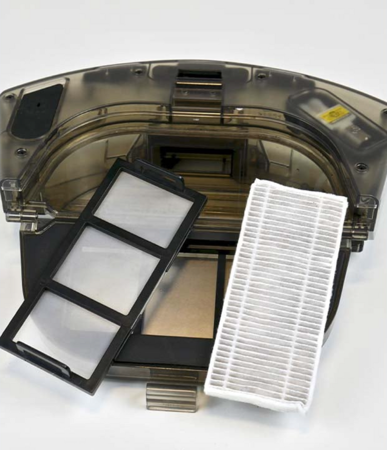 Лазерный дальномер снабжён тактильной кнопкой, поэтому под шкафом не застрянет. Кнопки на лицевой панели отправляют робота домой или включают уборку. Помимо маленького окошка впереди, на бампере имеются два боковых, а также амортизатор, смягчающий удары в мебель.