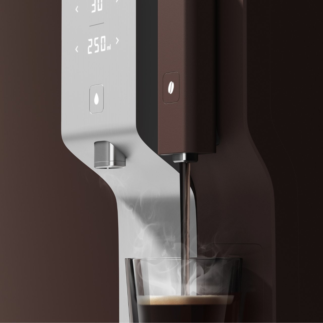 Coway Duo имеет четкое функциональное разделение: левая секция с серебристой отделкой отвечает за подачу очищенной воды с возможностью регулировки температуры и объема, правая секция коричневого цвета предназначена для приготовления капсульного кофе. Такое сочетание позволяет использовать очищенную от примесей и известкового налета воду для приготовления кофе, что положительно влияет на вкусовые качества напитка.