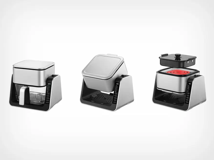 В комплект входят стеклянная корзина для режима аэрофритюрницы, металлическая решётка для циркуляции воздуха, а также прямоугольный противень глубиной около 7,6 см с антипригарным покрытием и стеклянной крышкой для использования в режиме варочной панели. Боковая панель управления позволяет регулировать температуру, выбирать режимы приготовления и настраивать скорость вращения вентилятора.