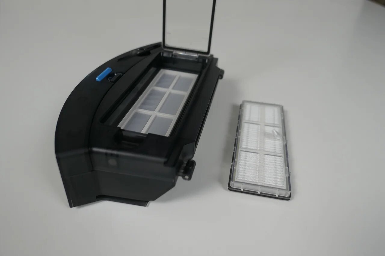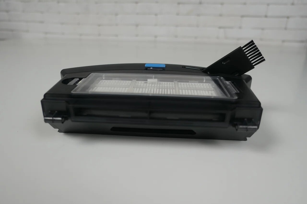 Пылесборник размещается сзади. Он представляет собой пластиковый коробок с откидной стенкой, через которую осуществляется обслуживание. Фильтрация двойная: сетка и НЕРА-фильтр. Во впускном отверстии сделан обратный клапан, чтобы мусор не вываливался обратно в воздуховод. Объём контейнера составляет 600 мл. Сверху имеется углубление для сервисной кисточки, чтобы она всегда была под рукой.