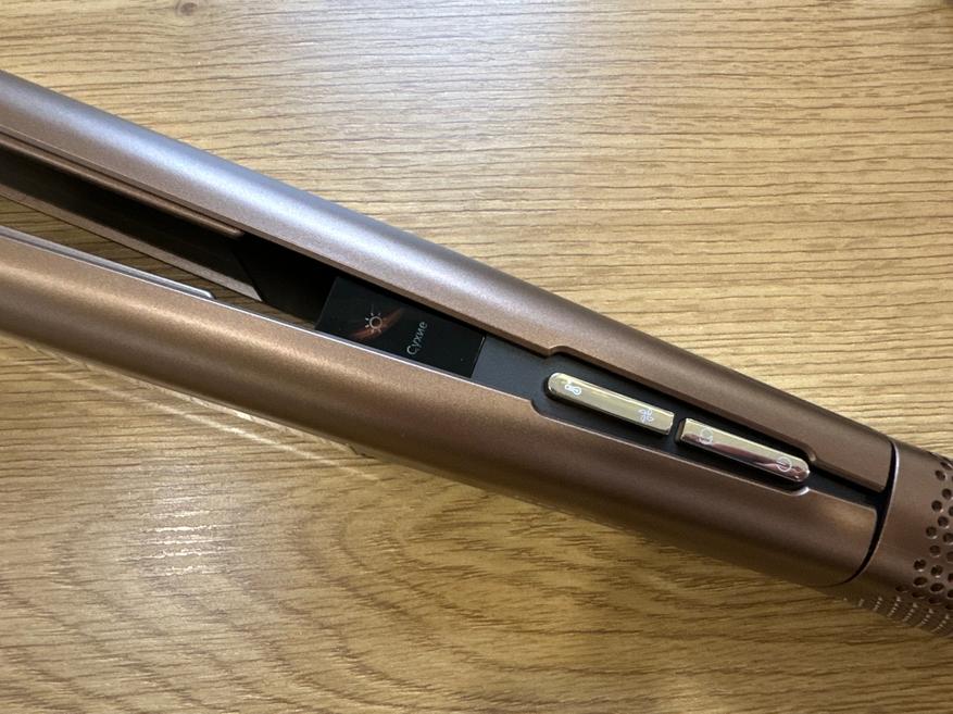 На противоположной стороне можно видеть панель управления с двумя продолговатыми кнопками-качельками с золотистым покрытием. Они отвечают за регулировку температуры, скорости потока и выбор режима: для мокрых, сухих волос или ухода за корнями. Все действия сопровождаются цветовой индикацией, а холодный обдув включается при удержании кнопки.