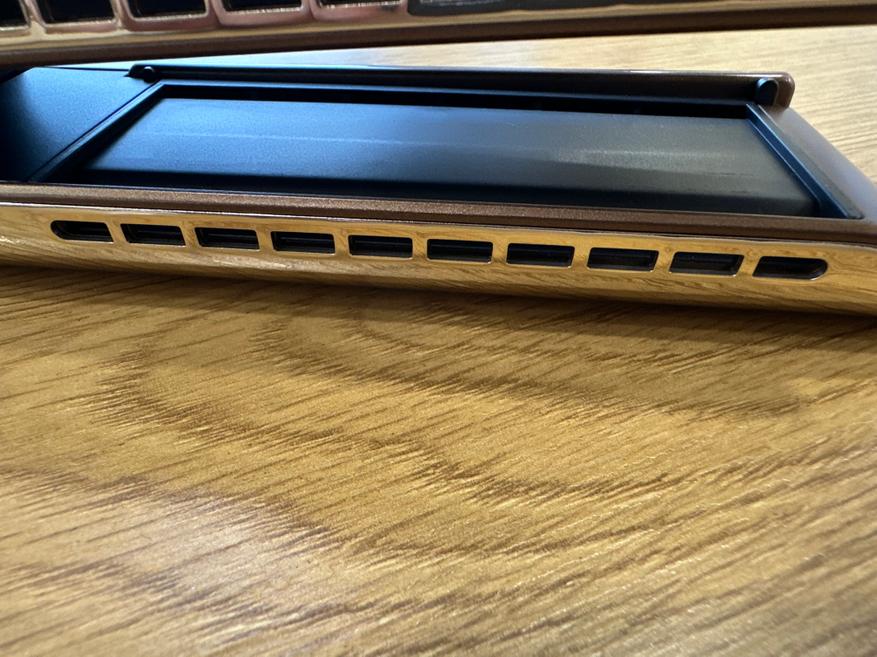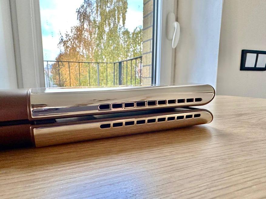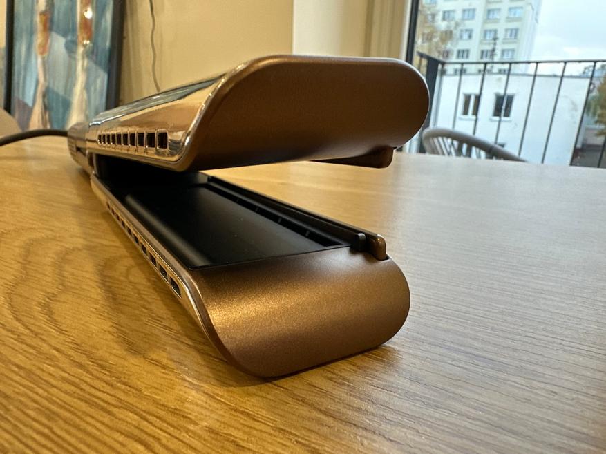 Форма корпуса не круглая, как у старых стайлеров, а с современными, чуть угловатыми линиями. На одном из торцов расположен переключатель фиксации. Здесь можно заметить и аккуратные продолговатые прорези для выхода воздуха — они образуют ровный ряд вдоль верхней панели. В центре корпуса расположен шарнир, соединяющий обе половины, он служит осью и позволяет раскрывать прибор так же, как обычный выпрямитель. Ощущение монолитности не пропадает даже при раскрытии корпуса.