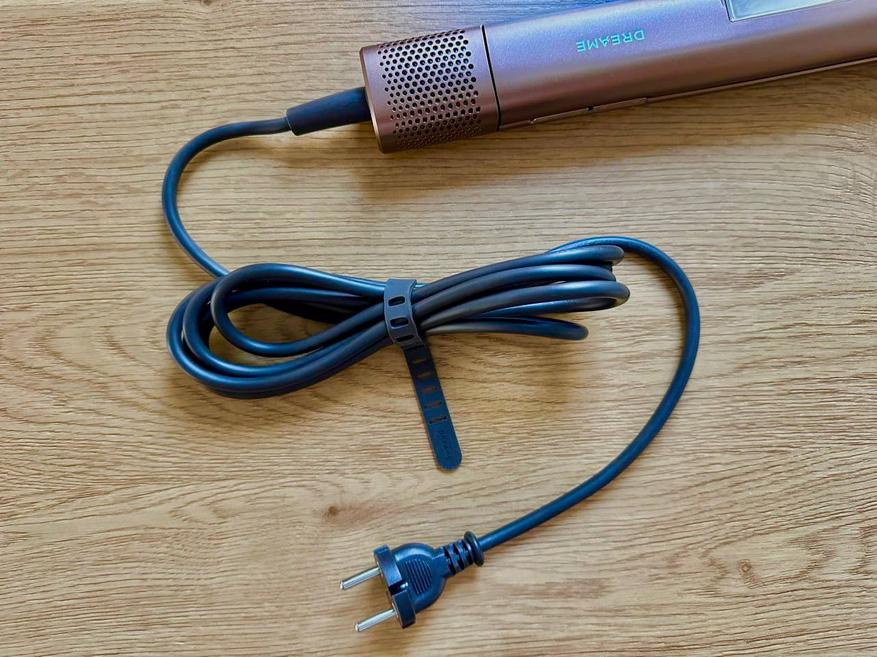 Провод выходит из нижней части рукоятки, без утолщений, и не мешает движению при укладке. Провод также внушает доверие, плотный, массивный, в тёплом цвете темного шоколада, с матовой поверхностью. Оснащён мягким силиконовым фиксатором и защитой от перегибов.
